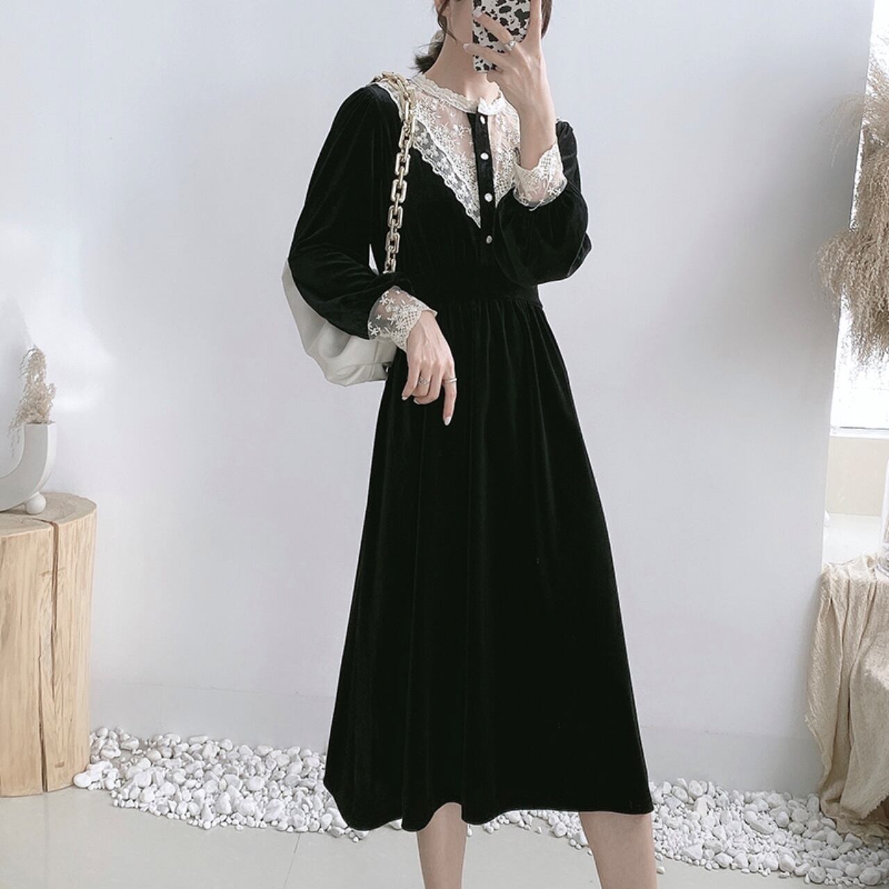 ワンピース レディース ベロア ベルベット レース パールボタン 膝下 ミモレ丈 Aライン 裾フレア 大人可愛い かわいい きれいめ 清楚 上品 エレガント 光沢感 大人 大人女子 こなれ感 クール フェミニン オシャレ ブラック 4サイズ サイズ豊富 学生 OL ママ ミセス 休日 お出かけ 二次会 謝恩会 セレモニー オケージョン 女子会 食事会 イベント ホームパーティー ファッション 簡単コーデ スタイルアップ 体型カバー 韓国 海外ファッション インポート モテ トレンド 流行 おすすめ 人気