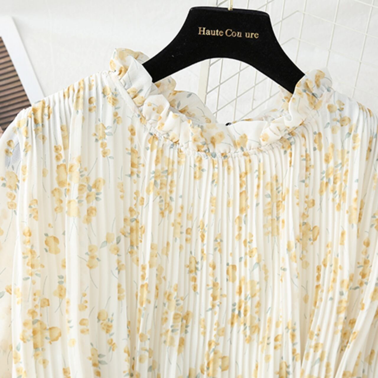 フリルネックとふんわりしたスカートのデザインでフェミニンスタイルに◎