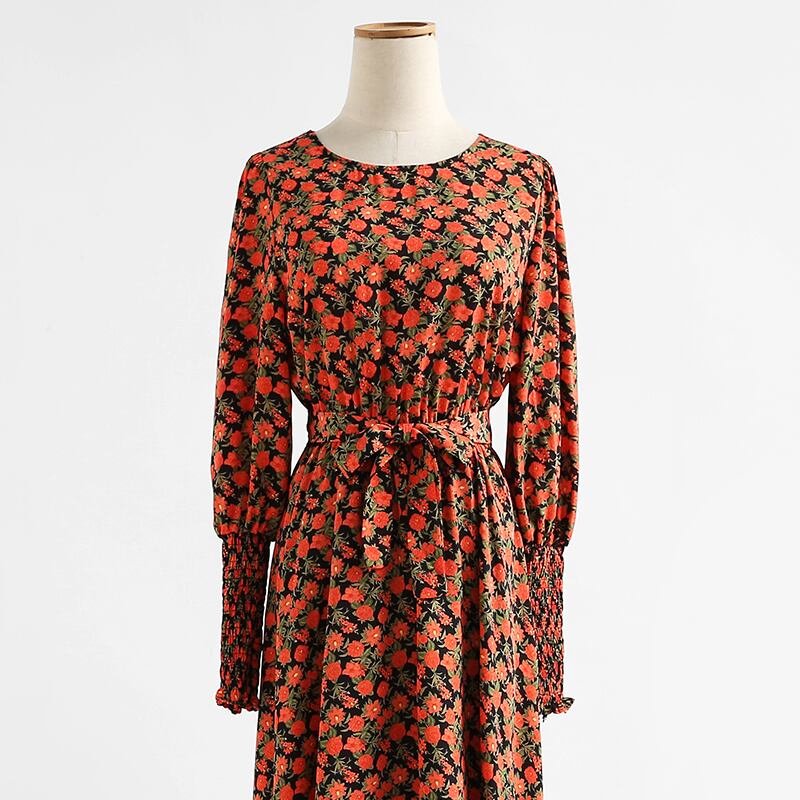 ワンピース レディース フレアワンピース Aラインワンピース ミモレ丈 長袖 柄 花柄 小花柄 春 秋 フレア スリム Aライン シフォン かわいい 大人可愛い きれいめ シンプル カジュアル 大人 上品 おしゃれ お洒落 大人可愛い 大人女子 エレガント クルーネック ミモレ 袖あり 赤 レッド オレンジ ベイクドカラー S M L XL 20代 30代 デート お出かけ 女子会 休日 パーティー イベント 普段使い 韓国 韓国系 オルチャン ファッション コーデ 楽ちん モテ 流行 インスタ映え