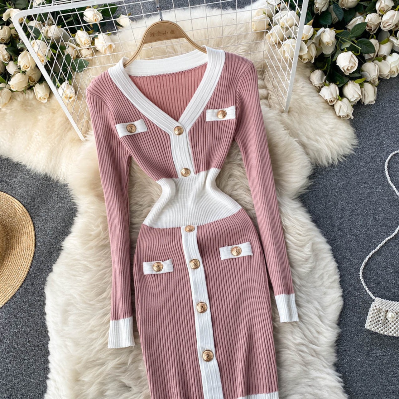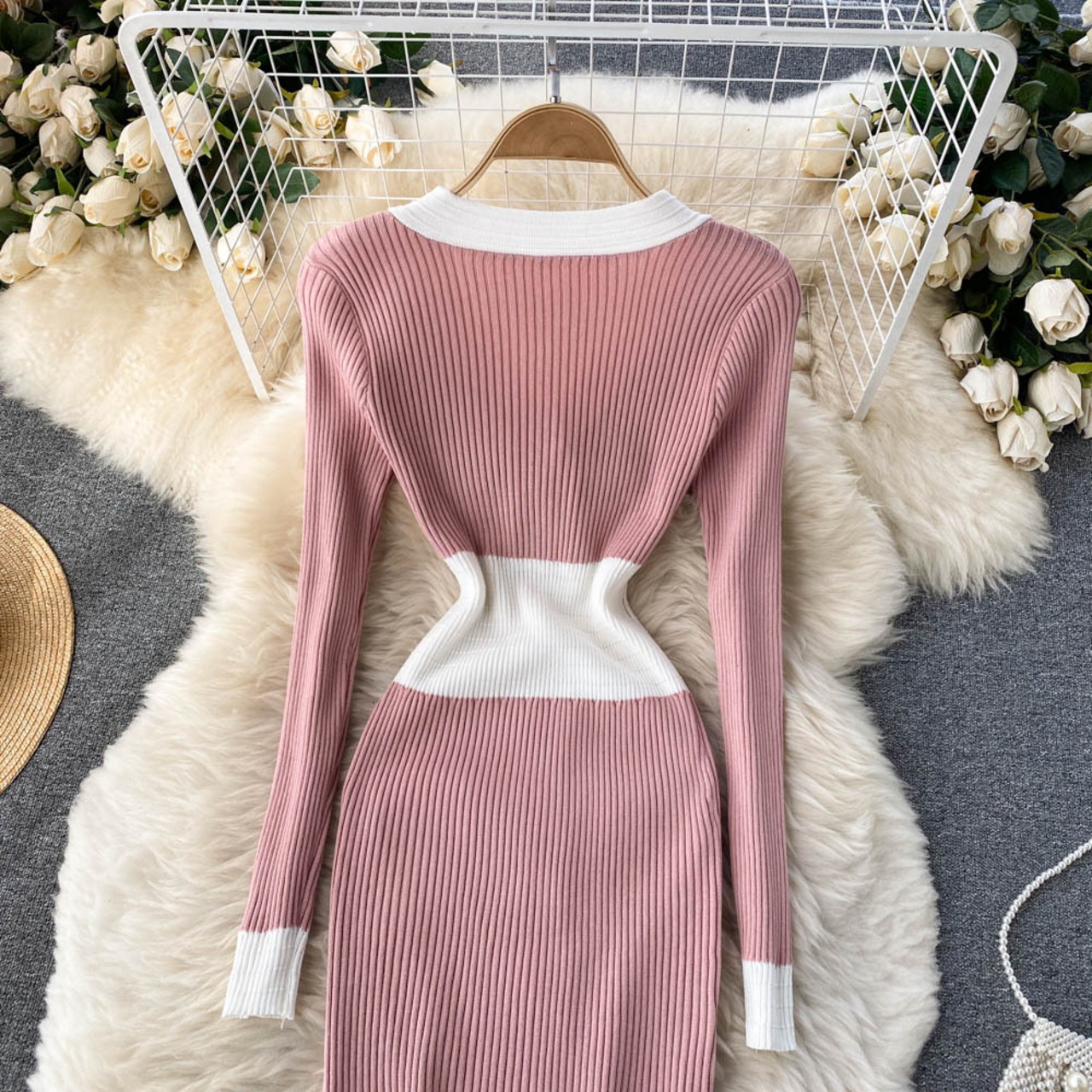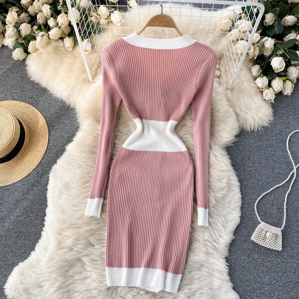 秋冬ニットワンピース ニット 暖かい ワンピースドレス トレンド トレンディ シンプル 流行 レトロ風デザイン かわいい おしゃれ 切り替えしカラー 収縮性 暖かい アイテム 海外ファッション 秋冬人気 大人クール スタイリッシュ オトナモード オルチャン 韓国デザイン 海外ファッション インスタ映え お出かけ 旅行 デート カジュアル パーティー OL ママ 二次会 飲み会 合コン 女子会 発表会 披露宴 モテ メンズライク レディースファッション レディース 婦人服 女性向け セレブ Vネックニット