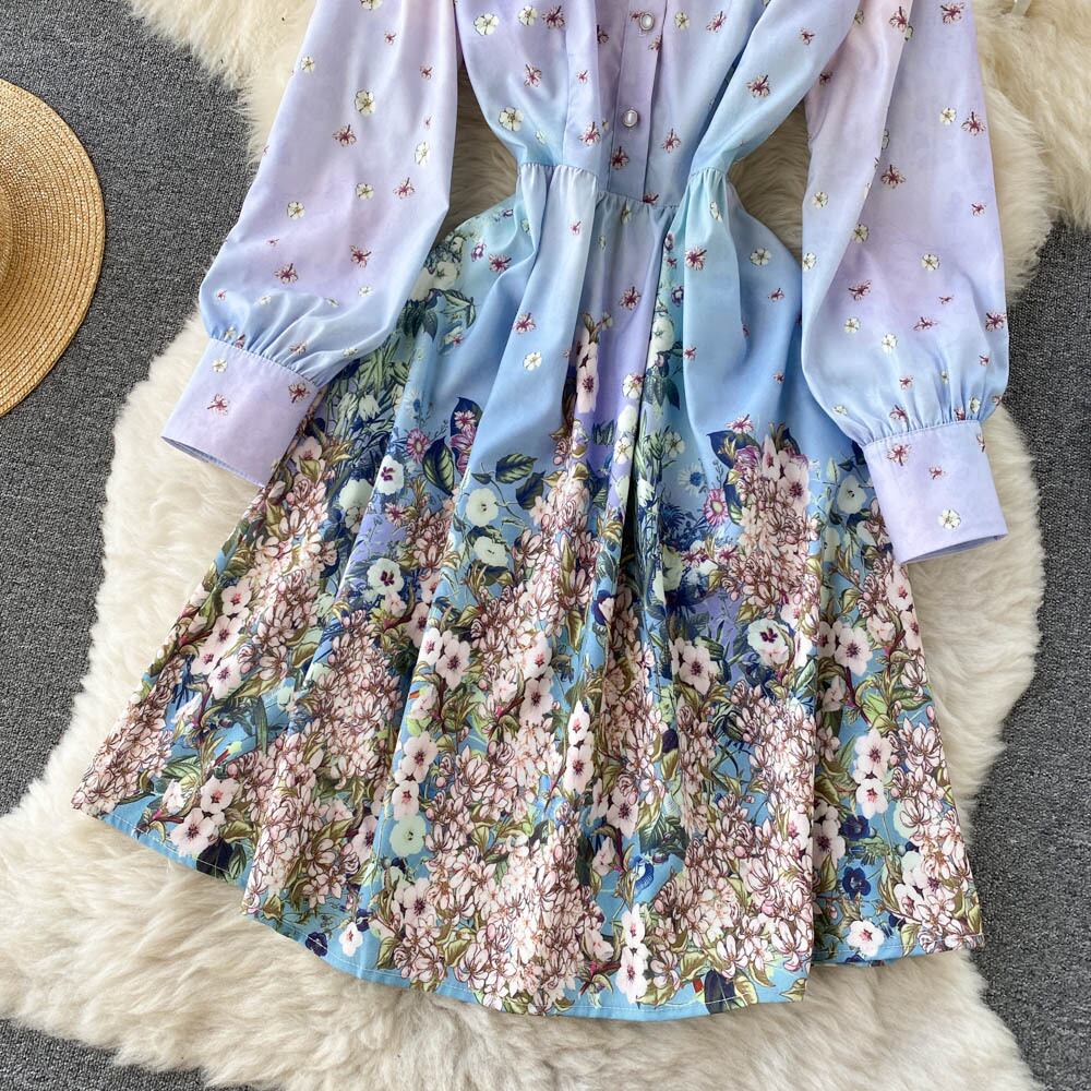 秋冬ワンピースドレス シャツ風ワンピース パーティードレス フラワープリント 花柄 長袖 ピンク ひざ丈ワンピース トレンディ ファッショナブル トレンド かわいい オシャレ 秋冬人気商品 お出かけ 旅行 デート カジュアル パーティー イベント 二次会 披露宴 発表会 ウエディング 主役級 存在感 デザイン重視 おしゃれ女子 オシャレ オトナモード クール スタイリッシュ 10代 20代 30代 OL ママ 二次会 飲み会 合コン 女子会 フレンチレトロ Aラインスカート グラデーションカラーワンピース