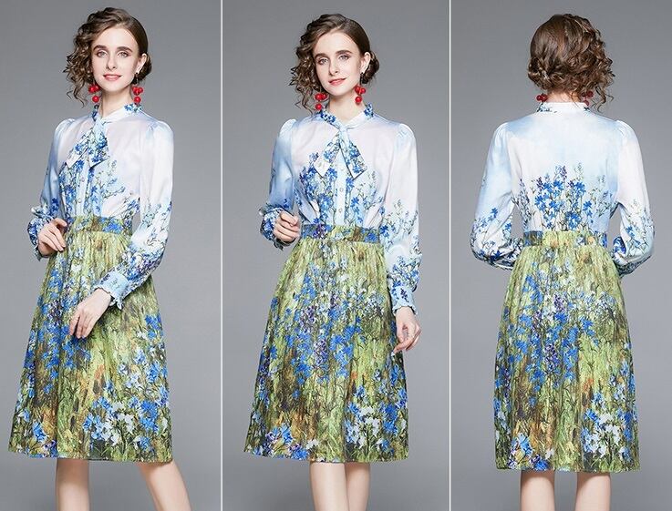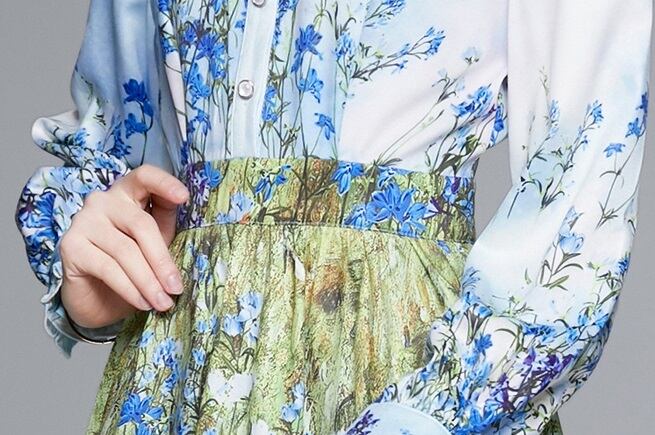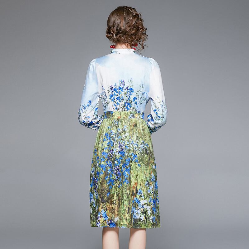 長袖ワンピース プリント柄 レディース ボタニカル プチハイネック ボウタイ ウエストマーク ミモレ丈 グラデーション ひざ丈 ブルー系 植物モチーフ リボン 前ボタン 艶感 ユニーク柄 春秋 着まわせる 大人っぽい エレガント 個性的 爽やか系 綺麗め 通勤 お食事 リモートワーク オフィススタイル お買い物 ショッピング 女子会 ランチ インスタ映え 春秋 大人女子 ふんわりスカート Aライン 簡単コーデ 韓国服 韓国ファッション 低価格 お買い得 プチプラ インポート クールフェミニン 高コスパ