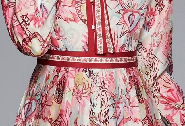 モチーフプリントワンピ レディース 長袖 ミモレ丈 襟付き レギュラーカラー リボン付き 脇ファスナー 襟レース スカートライン入り プリーツスカート スカーフ柄 総柄 ウエストマーク ピンク系 赤系 ハイウエスト フェミニン 上品 レトロモダン 大人可愛い ふんわりスカート テレワーク 通勤 お食事 ホームパーティー お呼ばれ ランチ お出かけ パーティー 華やか ガーリー インスタ映え リモートワーク 大人女子 韓国ファッション インポート 韓国服 プチプラ 高見え 低価格 お買い得 サイズ豊富