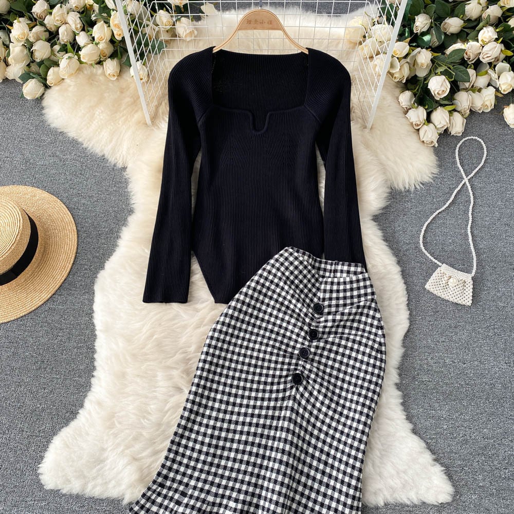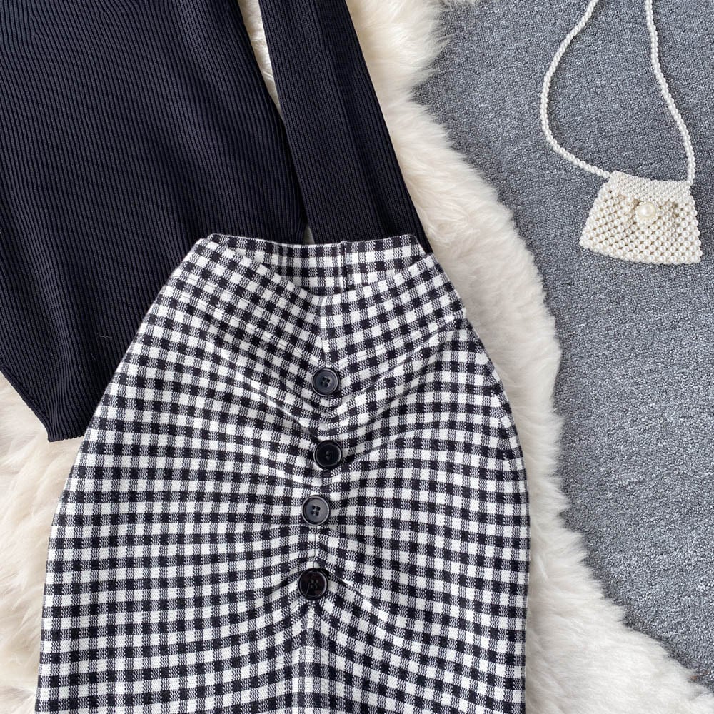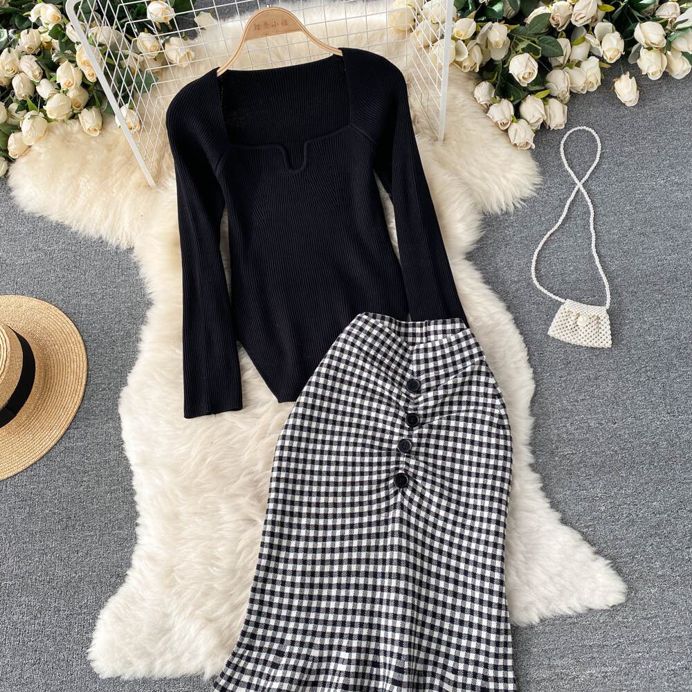 秋冬トレンド 上下セット フィッシュテールワンピース フィッシュテールスカート トップス ブラック チェック柄スカート ブラックシャツ かわいいデザイン セット 長袖 トップス オシャレ トレンド トレンディ シンプル 流行 レトロ風デザイン ホットアイテム 海外ファッション プチプラ ランキング キュート お勧め 大人女子 カジュアル 普段着 普段使い 着回し レディース レディースファッション 婦人服 おしゃれスーツ レトロチェック柄 ミドル丈 ファッションツーピース フィット ニットボトミングシャツ