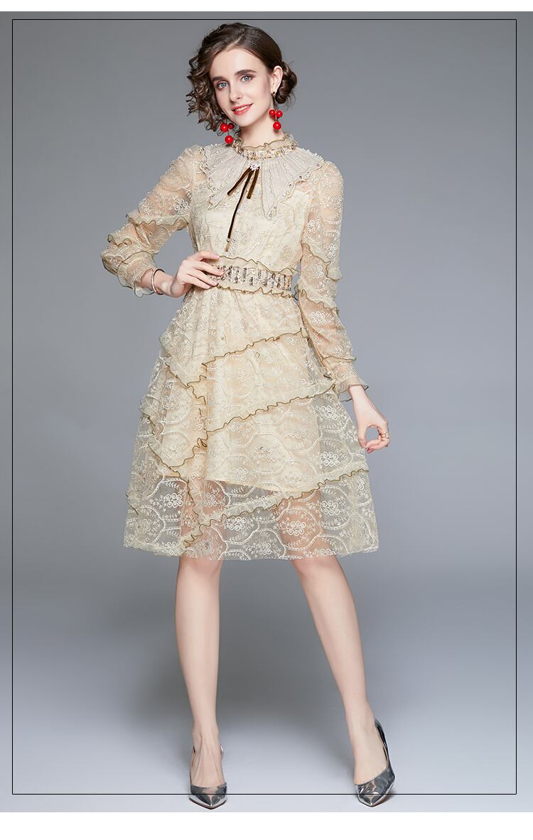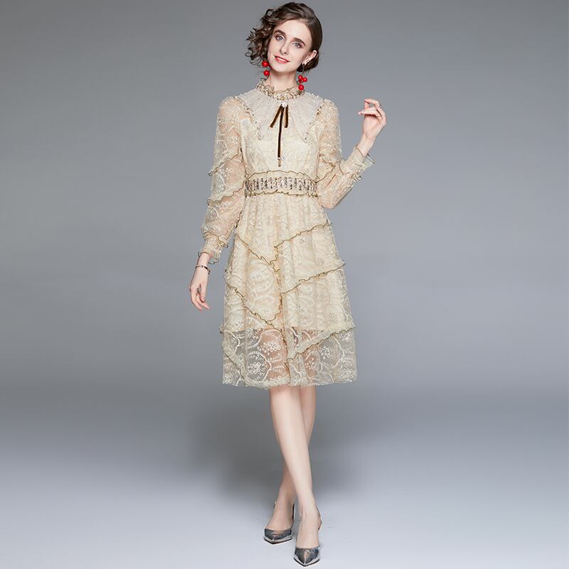 レース長袖ワンピース レディース フリル リボン付き レギュラーカラー レース襟 Aライン ベルテッド プチハイネック シースルー ゴールドライン 花柄レース 大きめ襟 キラキラ ラメ 透け感 クリーム色 アイボリー 白系 ナチュラルカラー カフス ハイウエスト 上品 ラグジュアリー ゴージャス 清楚 クラシカル レトロ感 レトロシック パーティー ワンピースドレス ホームパーティー ディナークルーズ お呼ばれ ウエディング 披露宴 お食事 特別感 レーシー ガーリー フェミニン 大人可愛い 大人女子