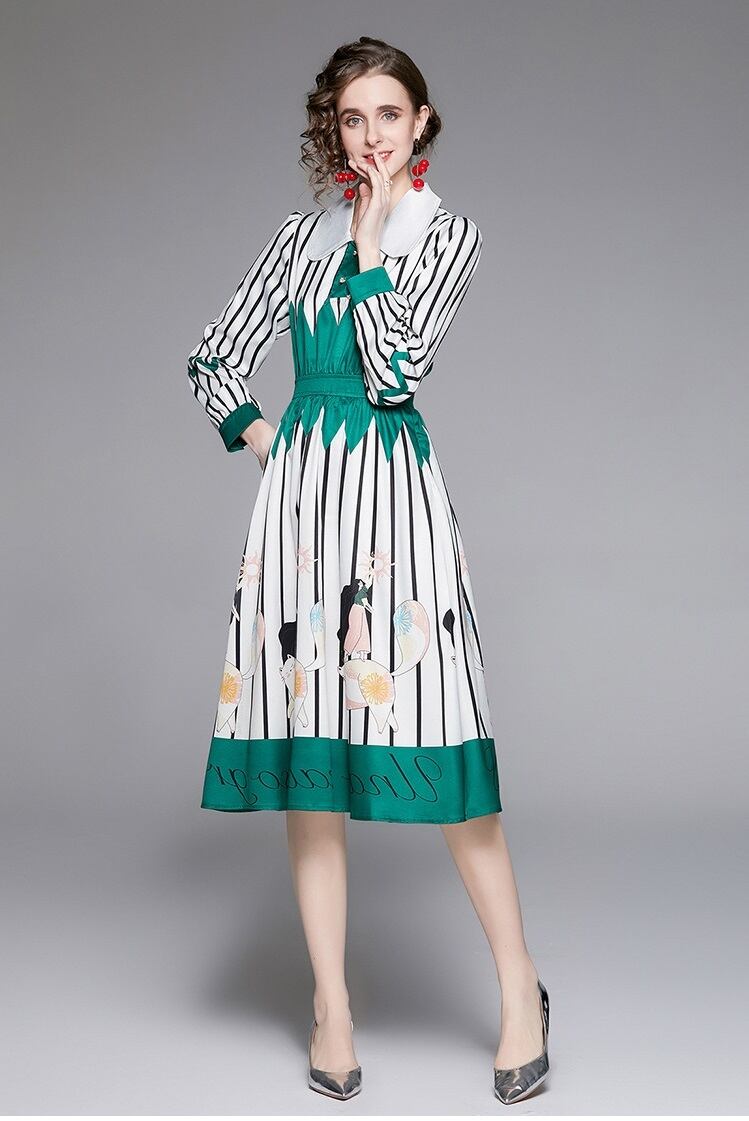 配色ワンピース 長袖 ストライプ レディース 総柄 丸襟 ミモレ丈 前ボタン Aライン フレアスカート ハイウエスト 白襟 ベルテッド 裾ライン グリーン系 ホワイト系 可愛い 大人可愛い レトロ レトロモダン ポップ おしゃれ トレンド ユニーク柄 スッキリ感 80年代 90年代 通勤 通学 お食事 オフィス リモートワーク テレワーク ホームパーティー 春秋 上品 レディライク 視線効果 韓国ファッション 韓国服 インポート プチプラ お買い得 簡単コーデ 値段重視 サイズ豊富 大きめサイズ 2XL