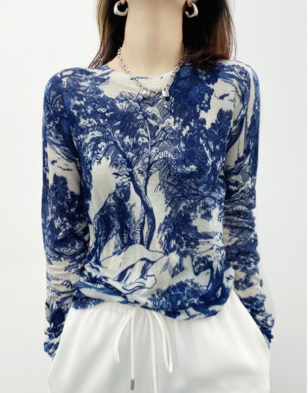 インク絵 レディースシャツ ブルー 青 プリント フラワー 花柄 リーフ柄 シック 袖あり 長袖 襟なし スリム 細身 エレガント 上品 抜け感 あか抜け おしゃれ 大人女子 トレンド パーティー ホームパーティー お呼ばれ 披露宴 女子会 お出かけ ディナー デート 韓国服 韓国ファッション インポート 低価格 お買い得 プチプラ S M L XL エイジレス 20代 30代 40代 OL 通勤 学生 通学 秋冬 簡単コーデ 高コスパ イベント 旅行 楽ちん ファション ラブリー キュート 個性的