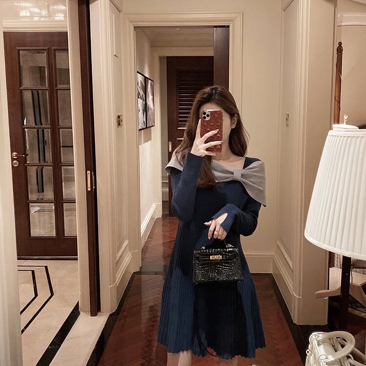肩から胸元にかけての大きなリボンが印象的なニットワンピースです。