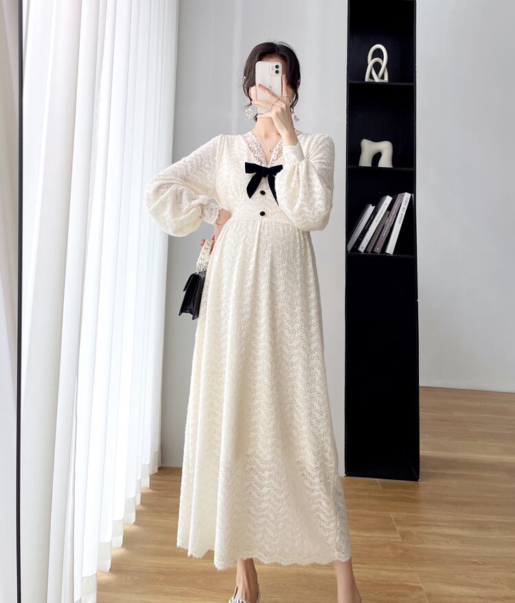 ワンピース 妊婦さん ニット ロングスカート ロング丈 ロング マタニティ マタニティウェア マタニティドレス 袖あり 長袖 袖長め シンプル アプリコット レース リボン ボタン Vネック ラフ ルーズ こなれ感 抜け感 大人可愛い かわいい 大人女子 OL ママ ミセス ショッピング 公園 休日 デイリー お出かけ 食事会 女子会 着回し 普段使い 韓国系 インポート 海外ファッション セレクト モテ おすすめ 人気 簡単コーデ 体型カバー スタイルアップ 楽ちん 伸縮性 トレンド ストレート