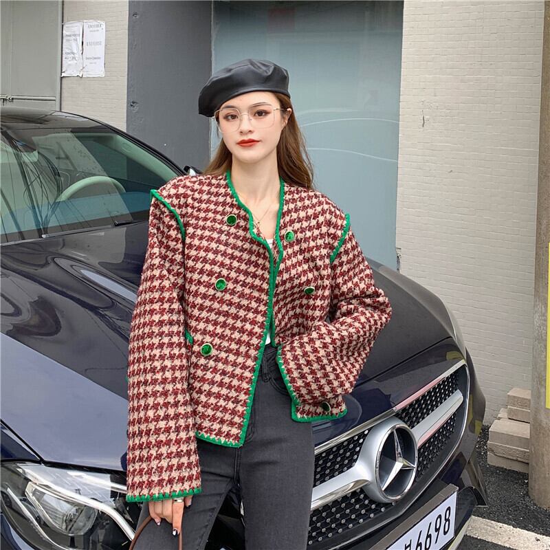 アウター コート 千鳥格子 ウールコート ショート丈 レッド ブラック 赤 黒 長袖 2カラー 柄 ラウンドネック 秋 冬 カジュアル ラフ ルーズ こなれ感 抜け感 きれいめ 上品 オシャレ お洒落 定番 大人可愛い かわいい 大人女子 大人 クール 10代 20代 30代 学生 通学 OL 通勤 公園 旅行 休日 お出かけ ショッピング デート 食事会 女子会 着回し 普段使い 韓国系 インポート 海外ファッション セレクト モテ おすすめ 人気 暖かい あったか スタイルアップ 新作 簡単コーデ