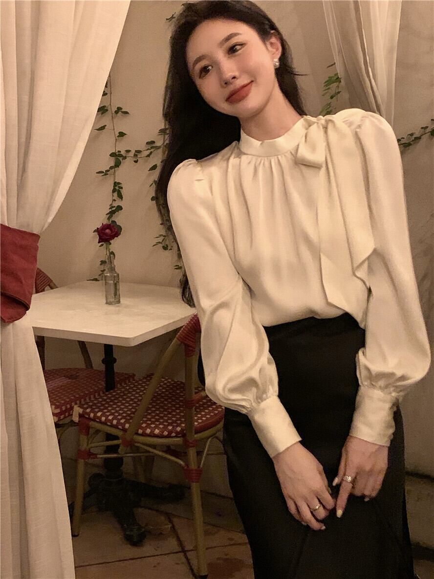 トップス レディース ブラウス シャツ 袖あり 長袖 ボリューム袖 ハイネック 光沢 スカーフカラー ロングカフス リボン ギャザー 無地 白 ホワイト かわいい 大人可愛い 大人 大人女子 きれいめ おしゃれ お洒落 シンプル ラブリー キュート ガーリー フェミニン 10代 20代 30代 通勤 学生 通学 デート お出かけ 女子会 休日 イベント 普段使い カジュアル こなれ感 ラフ ルーズ 抜け感 ゆったり ゆる 上品 エレガント パーティー とろみ感 リゾート 旅行 モテ 着回し 存在感