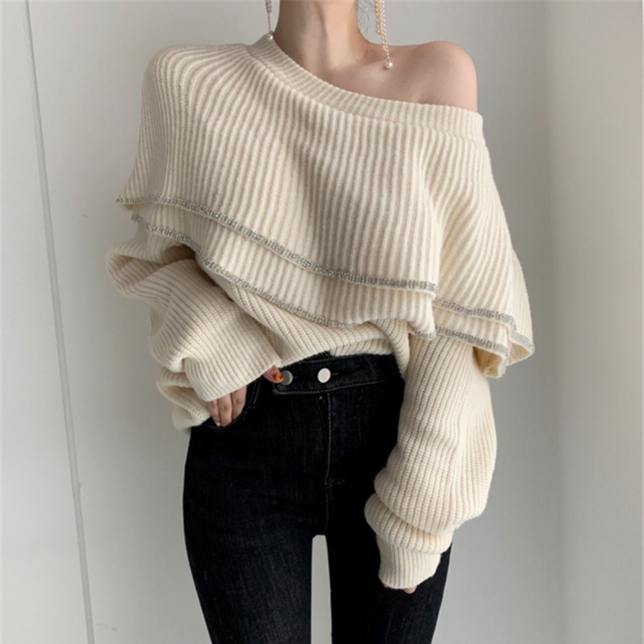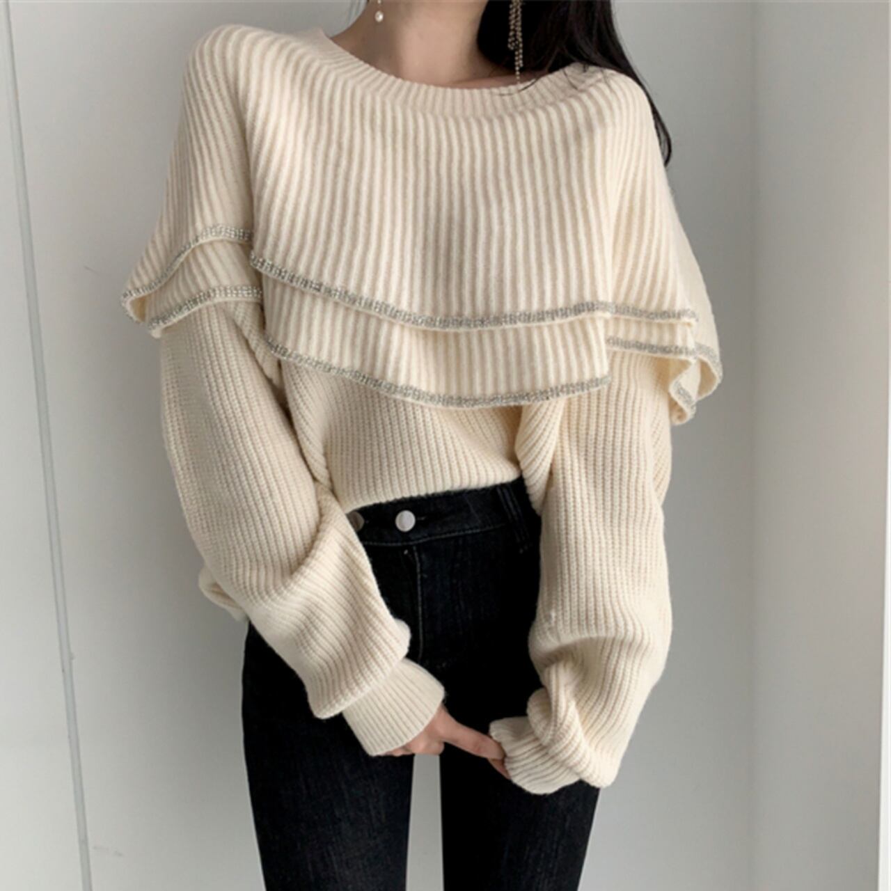 トップス レディース ニット フリル ティアード クルーネック 長袖 袖長め アプリコット ブラック 無地 ワンサイズ 秋 冬 大人可愛い かわいい 大人女子 大人 カジュアル ラフ ルーズ こなれ感 抜け感 きれいめ 上品 オシャレ お洒落 定番 学生 通学 OL ママ ミセス 公園 旅行 休日 お出かけ ショッピング デート 食事会 女子会 着回し 普段使い 韓国系 インポート 海外ファッション セレクト モテ おすすめ 人気 体型カバー スタイルアップ 新作 簡単コーデ トレンド 流行