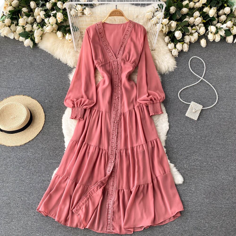 ワンピース レディース ロングスカート ロング丈 ロング 袖あり 長袖 Vネック 襟なし 襟なし レース ボタン ボタンダウン レトロ 宮廷風 カラバリ豊富 黄色 イエロー 黒 ブラック 紫 薄紫 パープル 緑 グリーン ピンク 赤 レッド かわいい 大人可愛い 大人 大人女子 きれいめ おしゃれ お洒落 ラブリー キュート ガーリー フェミニン 10代 20代 30代 学生 デート お出かけ 女子会 休日 普段使い カジュアル こなれ感 抜け感 上品 エレガント 二次会 披露宴 パーティー イベント