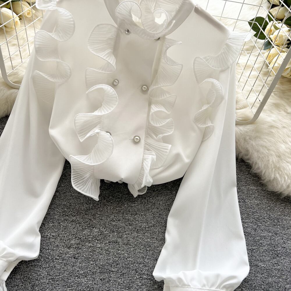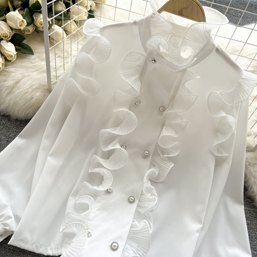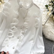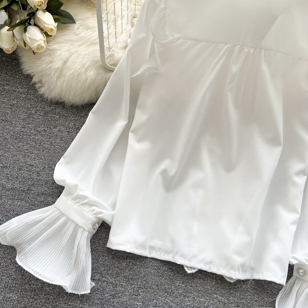 ブラウス 白 ホワイト 黒 ブラック 大人カラー モノトーン スリム ストレート レース シフォン 前開き かわいい 大人可愛い きれいめ シンプル カジュアル 大人 上品 おしゃれ お洒落 大人可愛い 大人女子 モダン フォーマル とろみ感 クルーネック 襟付き 袖あり レディース 長袖 無地 春 秋 冬 ワンサイズ 20代 30代 OL 通勤 学生 通学 デート お出かけ 公園デビュー 女子会 休日 着回し 韓国 韓国系 オルチャン ファッション コーデ スタイル トレンド 流行 インスタ映え