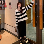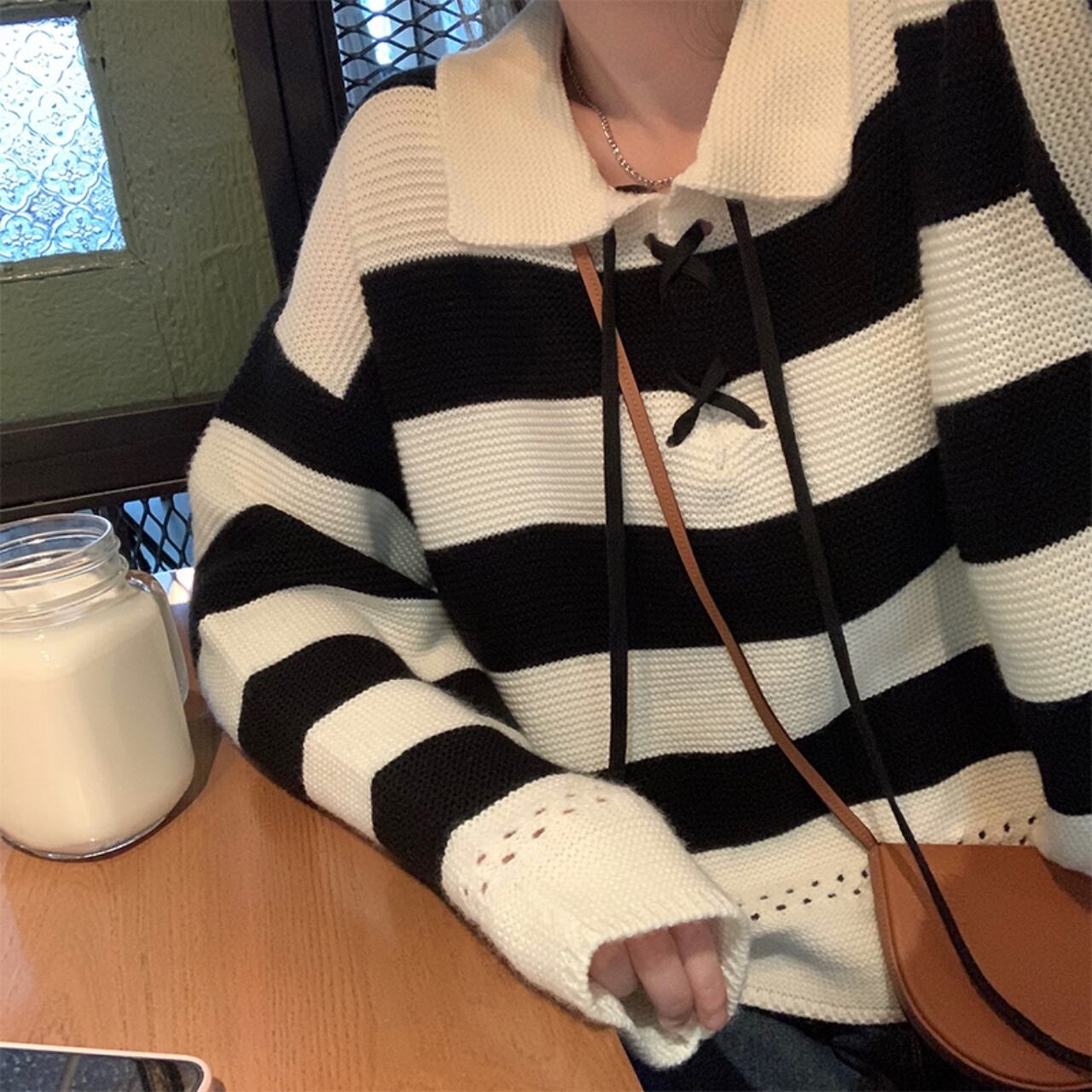 トップス ボーダー ブラック ベージュ ブラウン 襟付き リボン ニット オシャレ 秋 冬 カジュアル ラフ ルーズ 大人可愛い かわいい クール こなれ感 抜け感 オシャレ お洒落 存在感 定番 学生 通学 OL ママ ミセス 公園 旅行 休日 お出かけ ショッピング デート 食事会 女子会 着回し 普段使い 韓国系レディース プルオーバー ドロップショルダー インポート 海外ファッション セレクト モテ おすすめ 人気 体型カバー スタイルアップ 新作 簡単コーデ ハイセンス トレンド 流行 女子ウケ