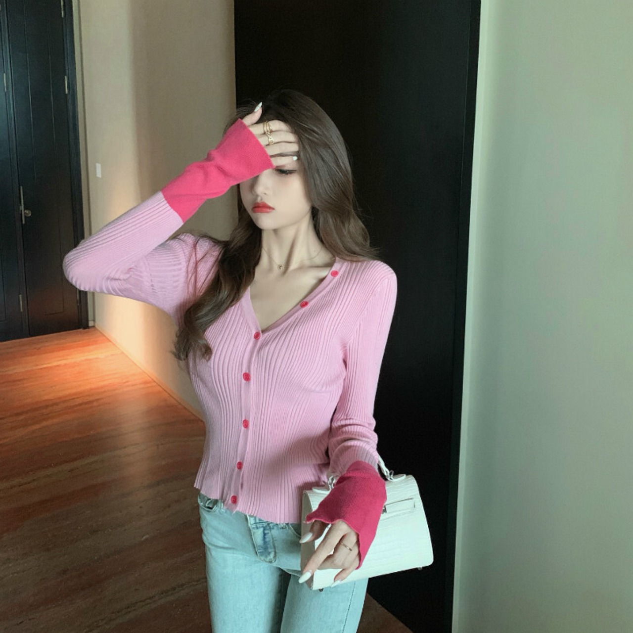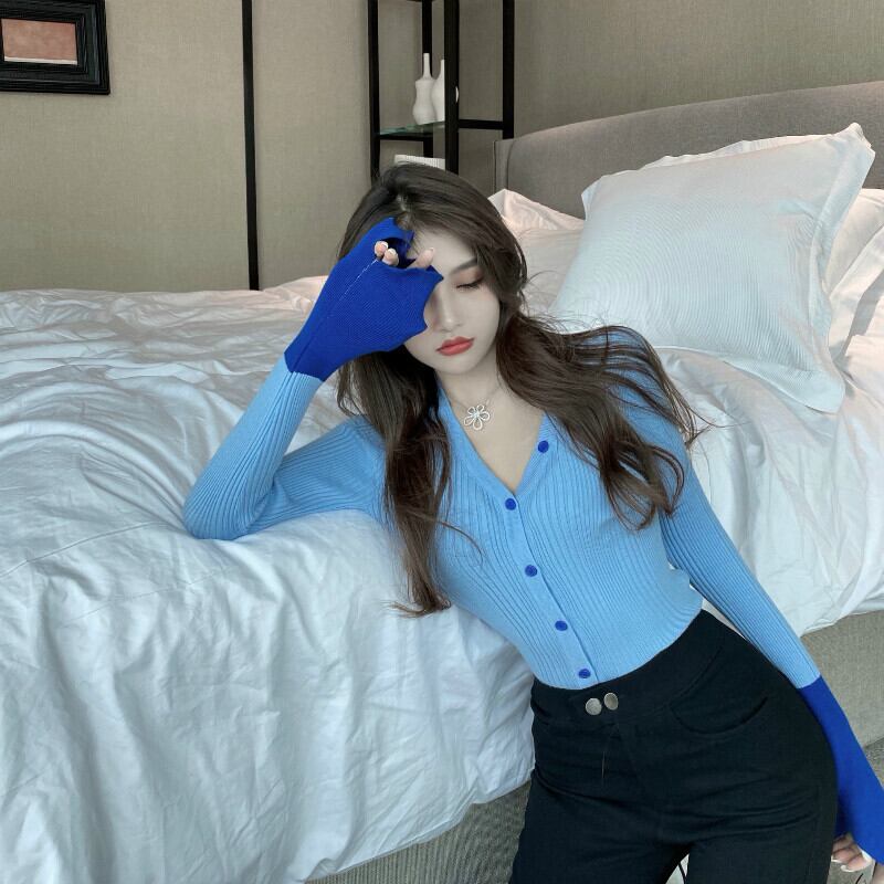 薄手ニットカーディガン レディース 前ボタン Vネック 変形袖 長め袖 配色 深めネック 両手カバー シンプルデザイン タイトカーディガン ブルー ピンク 単色 無地 簡単コーデ トレンド おしゃれ かっこかわいい クール 秋冬 デコルテ見せ ほっそり すっきり 大人女子 10代 20代 カジュアル ラフ 通勤 オフィスカジュアル リモートワーク テレワーク 休日スタイル デート ランチ 女子会 韓国ファッション 韓国服 インポート プチプラ お買い得 着やすい 着まわせる 低価格 低予算 値段重視
