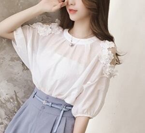 花のレースが付いた、可愛らしいシフォンブラウスです^^