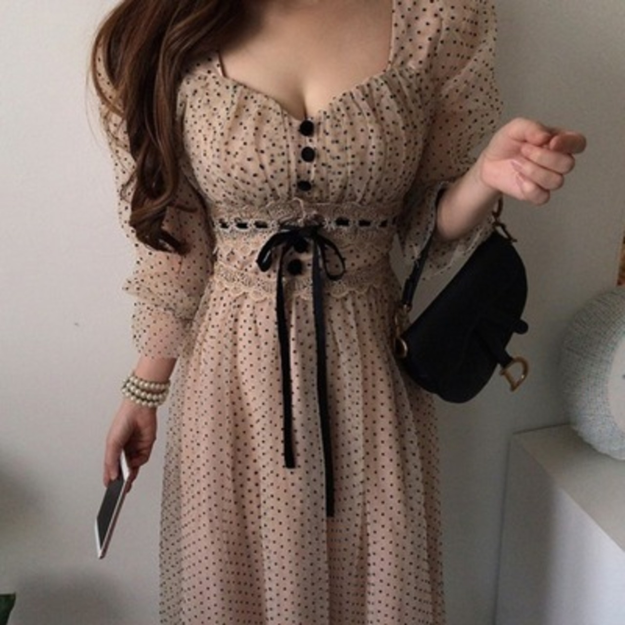 ワンピース レディース フレアワンピース Aラインワンピース ミモレ丈 長袖 柄 ドット 水玉 秋 冬 セミフレア スリム Aライン レース シフォン 透け感 シースルー かわいい 大人可愛い きれいめ シンプル カジュアル 大人 上品 おしゃれ お洒落 大人可愛い 大人女子 セクシー とろみ感 スクエアネック ミモレ 袖あり ピンク くすみカラー S M L XL 20代 30代 女の子 デート お出かけ 女子会 パーティー イベント 着回し 韓国 コーデ スタイル 楽ちん モテ 流行 インスタ映え