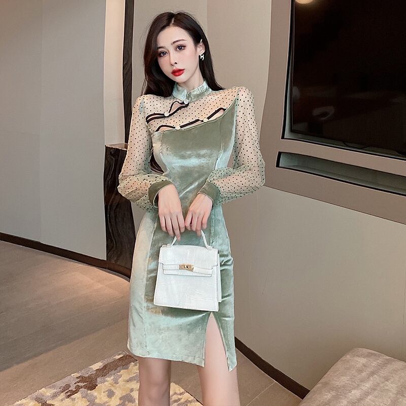 ワンピース コクーンワンピース ミニ丈 ショート丈 長袖 ドット 水玉 人気 スリム タイト 細身 ストレート Iライン レース 透け感 シースルー かわいい レディース 大人可愛い きれいめ シンプル カジュアル 大人 上品 おしゃれ お洒落 アジアン エスニック エキゾチック セクシー エレガント クルーネック ショート 袖あり 緑 グリーン くすみカラー 大人カラー S M L 20代 30代 女の子 デート お出かけ 女子会 休日 韓国 コーデ スタイル モテ トレンド 流行 インスタ映え