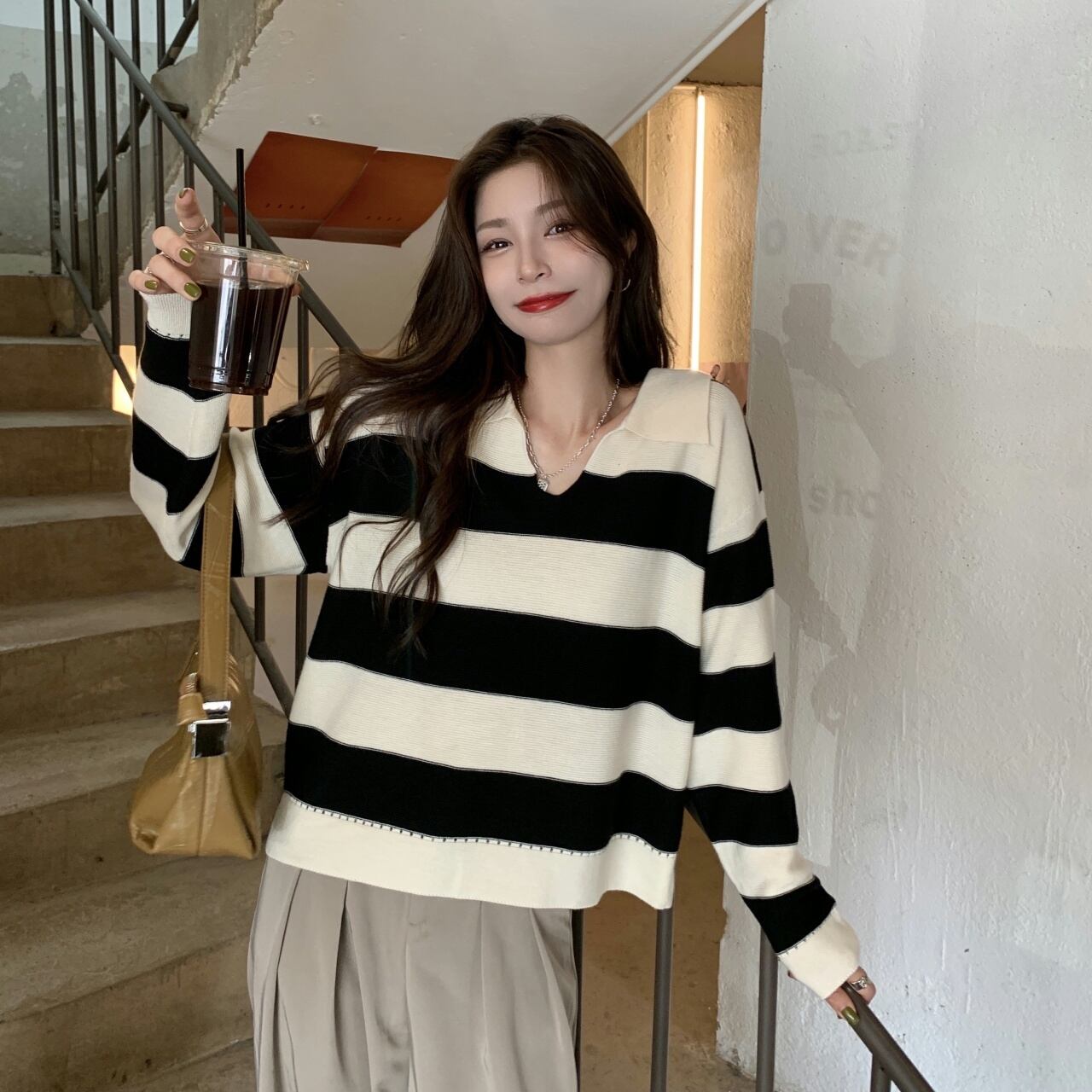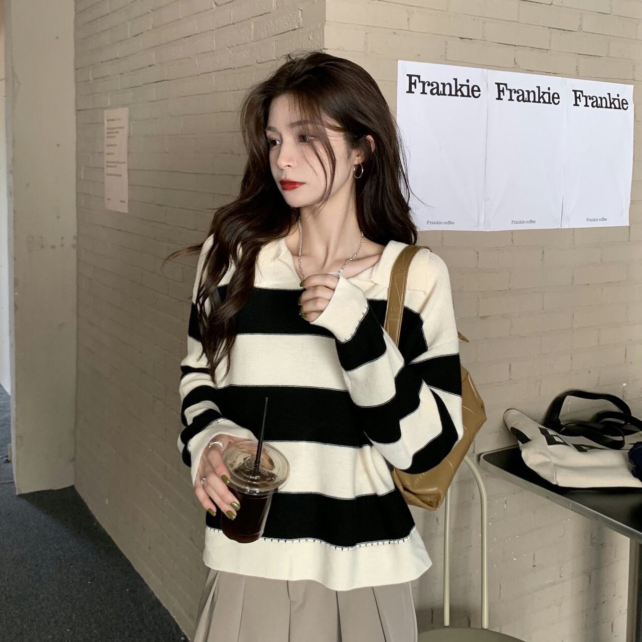 トップス レディース プルオーバー ドロップショルダー 襟付き 長袖 袖長め ボーダー ホワイト×ブラック 4サイズ サイズ豊富 秋 冬 カジュアル ラフ ルーズ きれいめカジュアル 大人可愛い かわいい こなれ感 抜け感 オシャレ お洒落 定番 学生 通学 OL ママ ミセス 公園 旅行 休日 お出かけ ショッピング デート 食事会 女子会 着回し 普段使い 韓国系 インポート 海外ファッション セレクト モテ おすすめ 人気 体型カバー スタイルアップ 新作 簡単コーデ ハイセンス トレンド 流行
