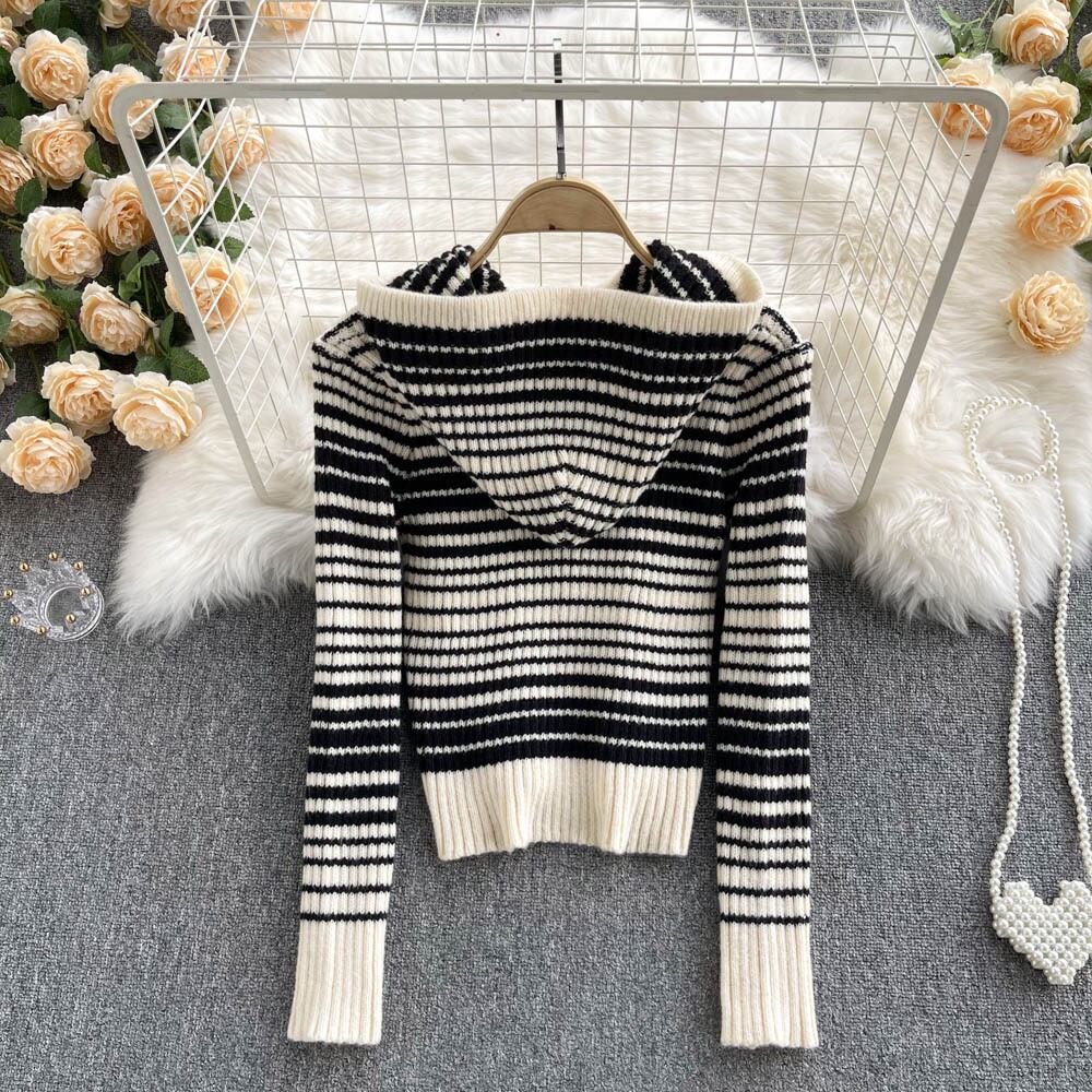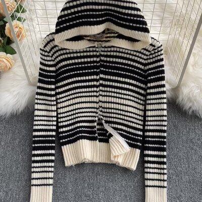ニット レディース カーディガン 長袖 ボーダー 春 秋 冬 スリム 細身 ストレート フード付き ファスナー 前開き 伸縮性 かわいい 大人可愛い きれいめ シンプル カジュアル 大人 上品 おしゃれ お洒落 レトロ 大人可愛い 大人女子 個性的 とろみ感 クルーネック 袖あり 黒 ブラック 大人カラー ベイクドカラー ワンサイズ 20代 30代 女の子 オフィス ビジネス OL 通勤 学生 通学 デート お出かけ 女子会 休日 着回し 普段使い 重ね着 韓国 ファッション 流行 インスタ映え