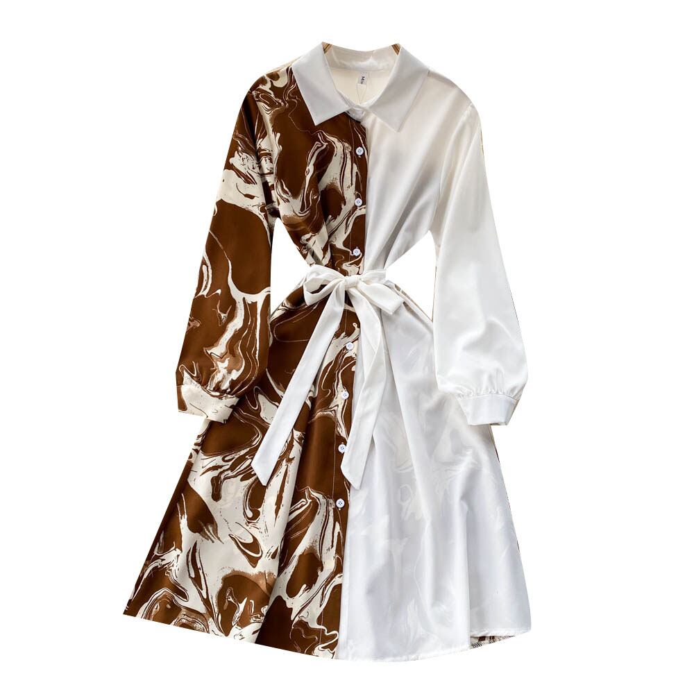 シャツワンピ レディース 長袖 ミモレ丈 前開き フロントボタン パフスリーブ レギュラーカラー デザインシャツ シックカラー ユニークデザイン ウエストリボン サークル柄 マーブル柄 格子柄 モダン レトロモダン レトロシック 大人っぽい 大人女子 きちんと感 主役級 清潔感 春秋 通勤 通学 ショッピング 女子会 ランチ お出かけ着 Aライン 大人女子 白系 黒系 ブラウン系 韓国ファッション 韓国服 インポート プチプラ 簡単コーデ 高見え おしゃれ 低価格 お買い得 値段重視 20代 30代