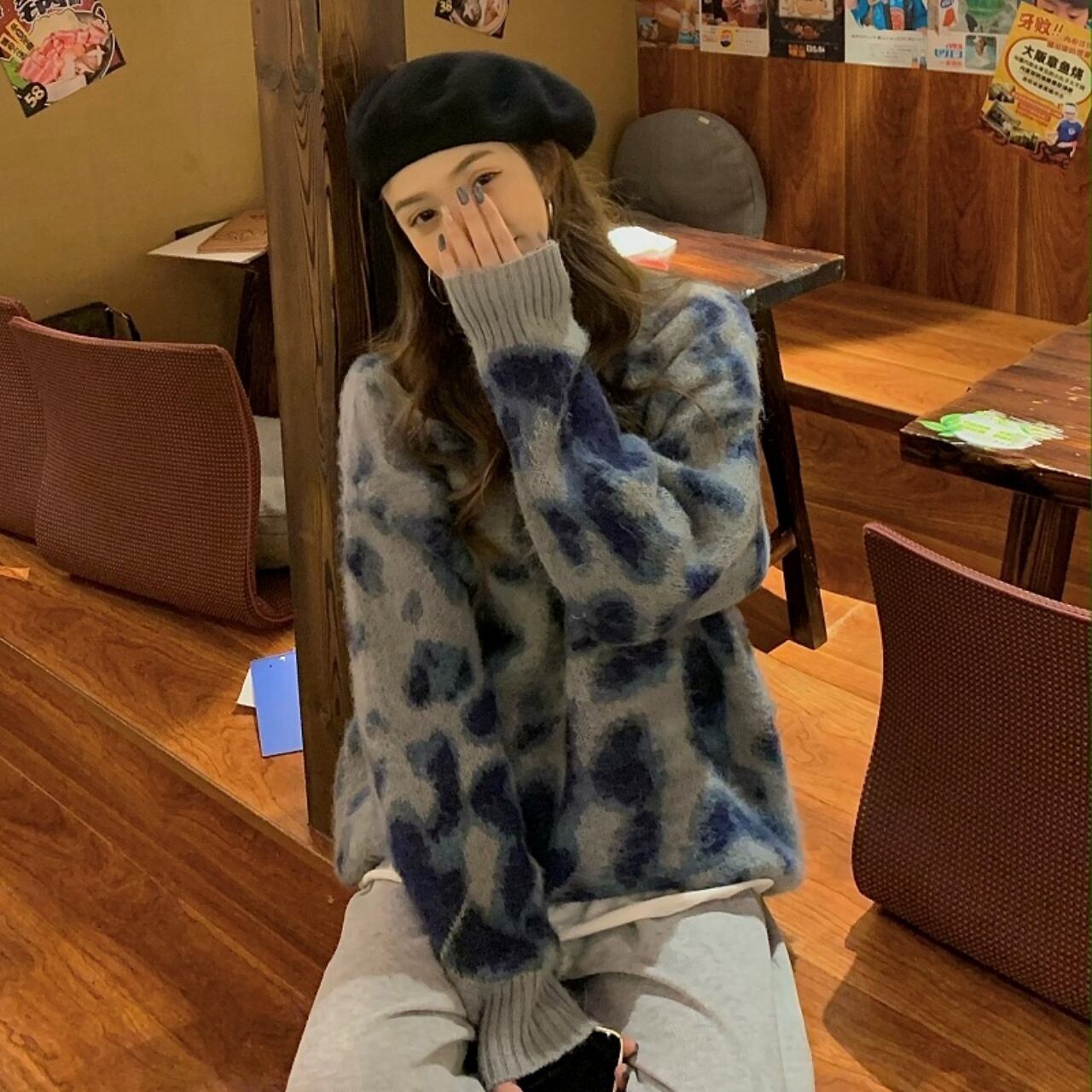 トップス ニット ヒョウ柄 ブルー 青 プルオーバー クルーネック ドロップショルダー オーバーサイズ 長袖 袖長め ぼかし柄 秋 冬 カジュアル ラフ ルーズ 大人可愛い かわいい こなれ感 抜け感 オシャレ お洒落 大人女子 女子ウケ 学生 通学 OL ママ ミセスレディース 公園 旅行 休日 お出かけ ショッピング デート 女子会 着回し 普段使い 韓国系 インポート 海外ファッション セレクト モテ おすすめ 人気 スタイルアップ 新作 簡単コーデ ハイセンス トレンド 流行 重ね着 着やせ効果
