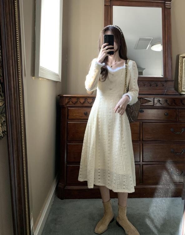 レディース 長袖 ワンピースニット ファー飾り パフスリーブ スクエアネック アラン模様 白 オフホワイト ミモレ丈 後ろファスナー 裏地付き 無地 単色 セミフレアスカート デコルテ見せ 柔らか素材 ウエスト切り替え フロント飾りボタン 上品 清楚 クラシカル 清潔感 清純派 乙女系 姫系 通勤 通学 デート ディナー お呼ばれ 二次会 イベント パーティー お食事 クリスマス プレゼント おしゃれ かわいい 大人可愛い 好感度抜群 韓国ファッション 韓国服 アイドル系 トレンド 簡単コーデ 秋冬