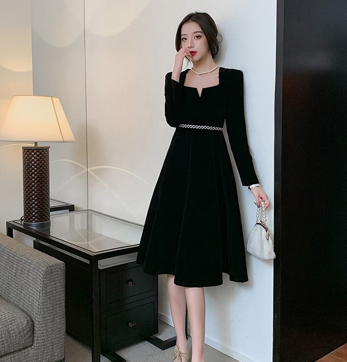 ワンピース フレアスカート 膝下 袖あり 長袖 襟なし スクエアネック デコルテ レディース バレリーナネック ウエストマーク 無地 黒 ブラック かわいい 大人可愛い 大人 大人女子 きれいめ おしゃれ お洒落 シンプル ラブリー キュート ガーリー フェミニン 10代 20代 30代 通勤 学生 通学 デート お出かけ 女子会 休日 普段使い カジュアル 着回し こなれ感 ラフ ルーズ 抜け感 ゆる 光沢 上品 エレガント フォーマル 結婚式 二次会 披露宴 パーティー イベント 旅行 レトロ モテ