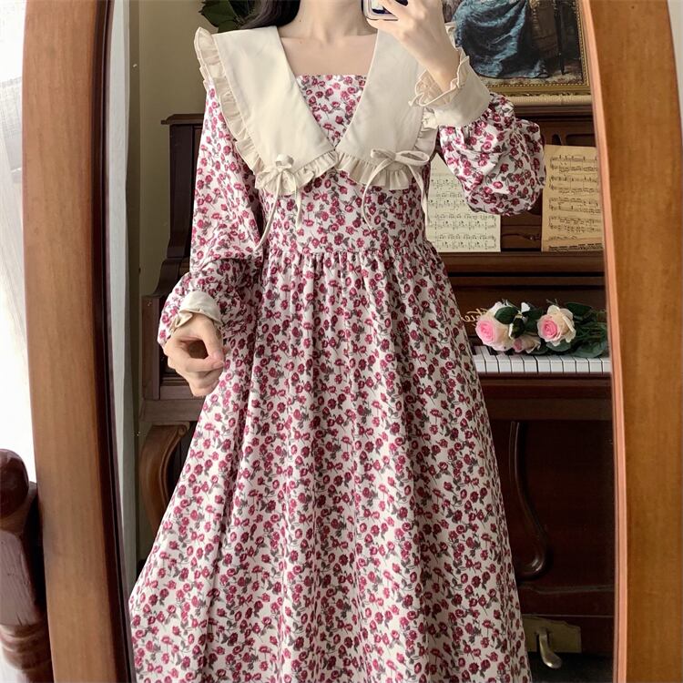ワンピース レディース フレアワンピース Aラインワンピース マキシ丈 長袖 柄 花柄 小花柄 フラワー 春 フレア Aライン かわいい 大人可愛い きれいめ シンプル カジュアル 大人 上品 おしゃれ お洒落 大人可愛い 大人女子 個性的 セクシー 存在感 とろみ感 スクエアネック ミモレ 袖あり 赤 レッド M L XL 2XL 3XL 20代 30代 デート お出かけ 女子会 休日 着回し 普段使い 韓国 韓国系 オルチャン コーデ スタイル 楽ちん モテ プチプラ トレンド インスタ映え