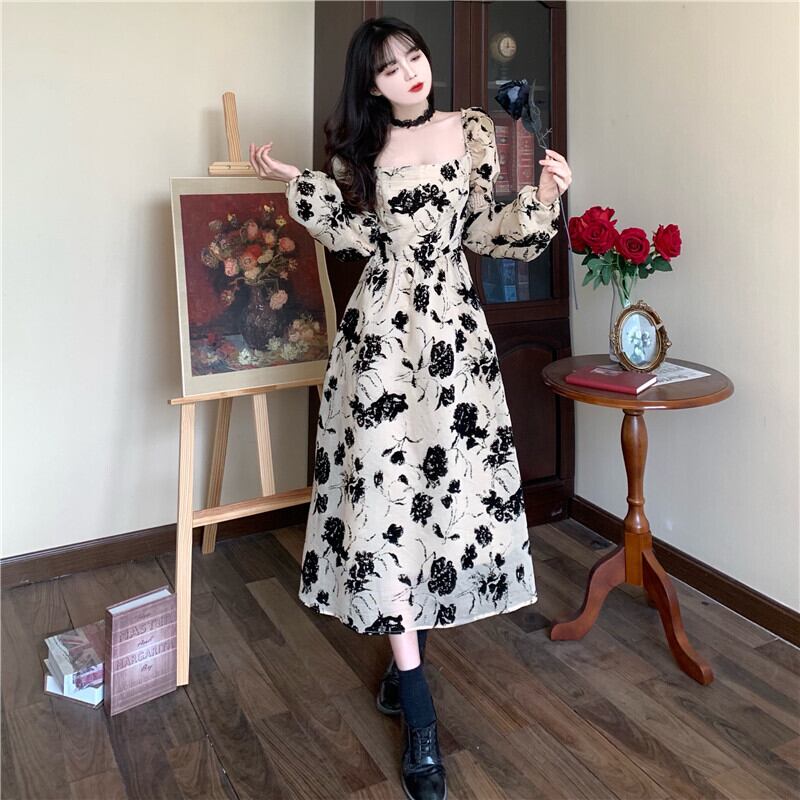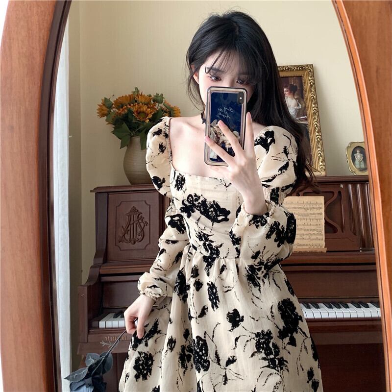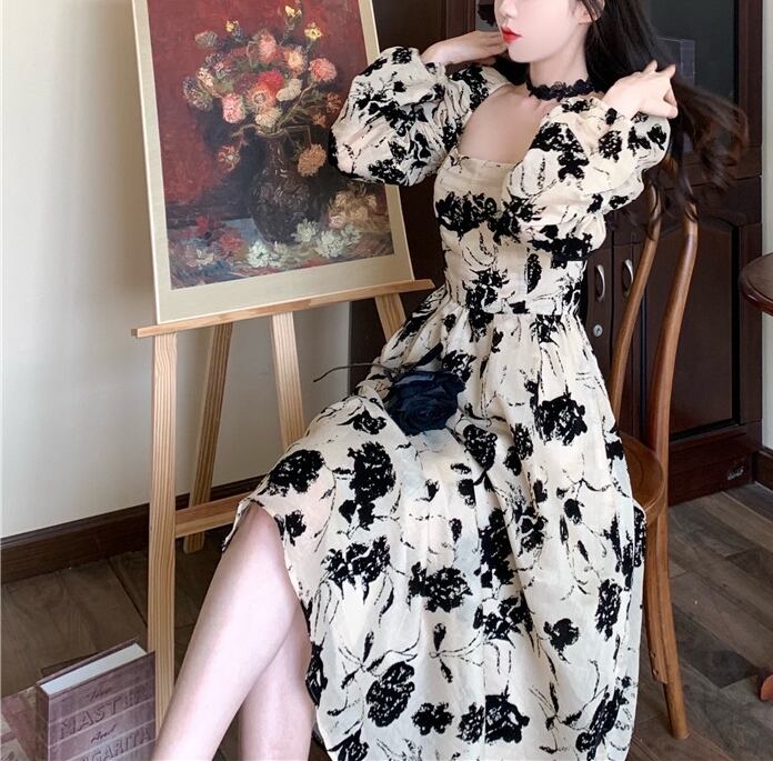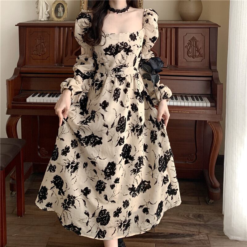 ワンピース レディース フローラルドレス 花柄ワンピース フラワー 小花 フラワーワンピ パフスリーブ袖 シック アプリコット プリーツドレス 新しい デザイン センス 洋風 ロングセクション ウエスト カジュアル プラスサイズ オールインワン セミフレア かわいい 大人可愛い きれいめ シンプル 大人 上品 おしゃれ お洒落 ラフ キュート カジュアル 普段使い エレガント 存在感 10代 20代 30代 デート お出かけ 女子会 休日 パーティー リゾート 旅行 海 韓国 オルチャン
