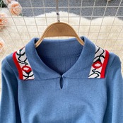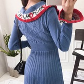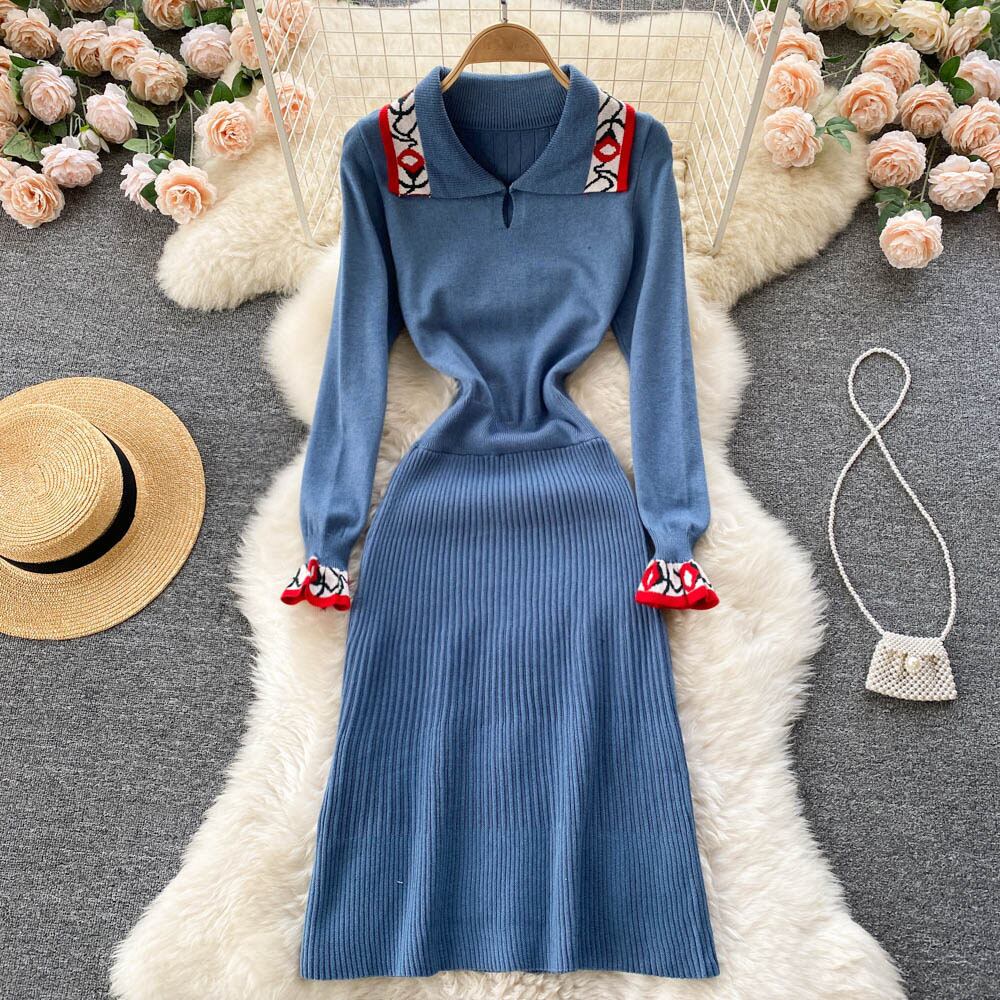 ニットワンピース キーネック レディース 長袖 襟付き 袖フリル キャンディースリーブ ミモレ丈 ロング丈 ミドル丈 水色 ブルー 襟柄 花モチーフ ワンポイント柄 ハイウエスト 爽やか系 和やか系 懐かしい レトロ感 可愛い おしゃれ トレンド 上品 清楚 好感度アップ 通勤 オフィス デート 女子会 ランチ お食事 デート リモートワーク テレワーク 大人可愛い 大人女子 韓国ファッション 輸入服 低価格 プチプラ 輸入服 春秋 お買い得 着やすい 簡単コーデ S M L 20代 30代 40代