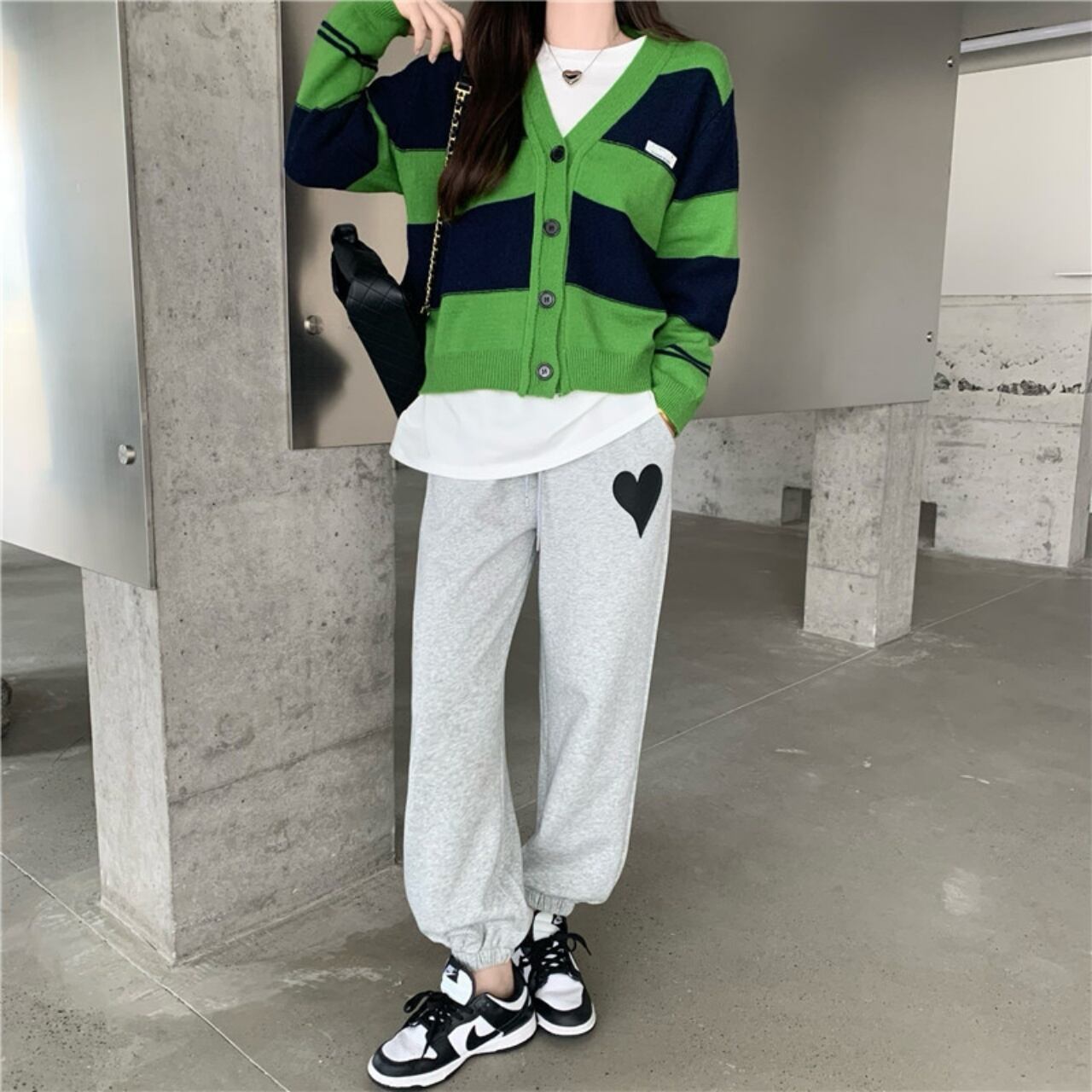 鮮やかなグリーンのボーダーが目を引くカーディガン