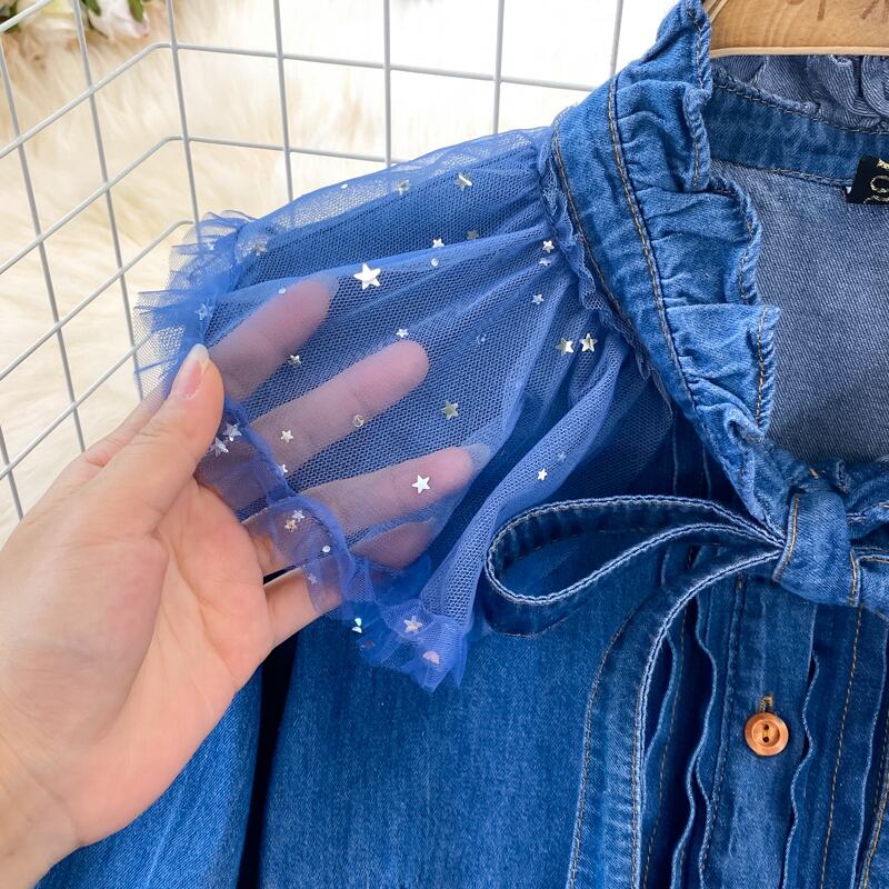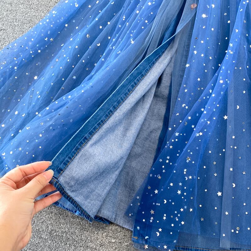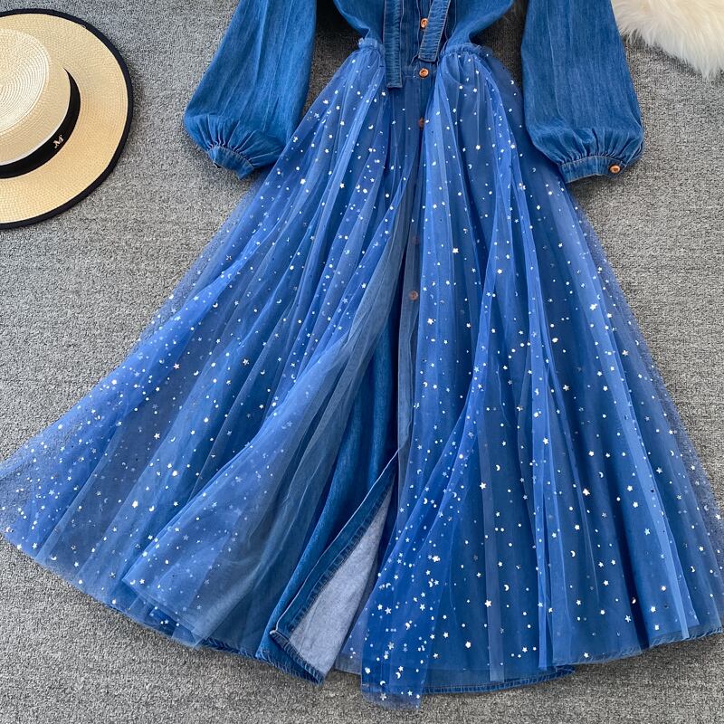 ワンピース チュールスカート デニムワンピース 夜空 星空 透け感 長袖 ボリューム袖 フリルスタンドカラー 異素材MIX チュール キラキラ スパンコール 透け感 リボン ボタン かわいい 大人可愛い 大人 大人女子 きれいめ おしゃれ お洒落 ラブリー キュート ガーリー フェミニン 10代 20代 30代 学生 通学 デート お出かけ 女子会 休日 普段使い インパクト カジュアル こなれ感 ラフ ルーズ 抜け感 ゆったり ゆる パーティー イベント レディース 人気 特別 おススメ 綺麗