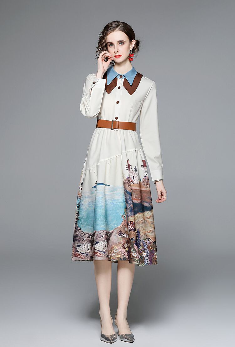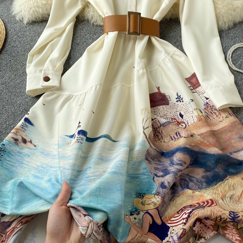 ワンピース ひざ丈 膝丈 プリント 風景 海辺 風景 袖あり 長袖 襟付き スタンダードカラー ウエストマーク ベルト ボタン アプリコット 白 レディース フレアスカート かわいい 大人可愛い 大人 大人女子 きれいめ おしゃれ お洒落 ラブリー キュート ガーリー フェミニン 10代 20代 30代 学生 通学 デート お出かけ 女子会 休日 普段使い インパクト カジュアル こなれ感 ラフ ルーズ 抜け感 個性的 存在感 ゆったり ゆる リゾート 海 二次会 披露宴 パーティー イベント モテ
