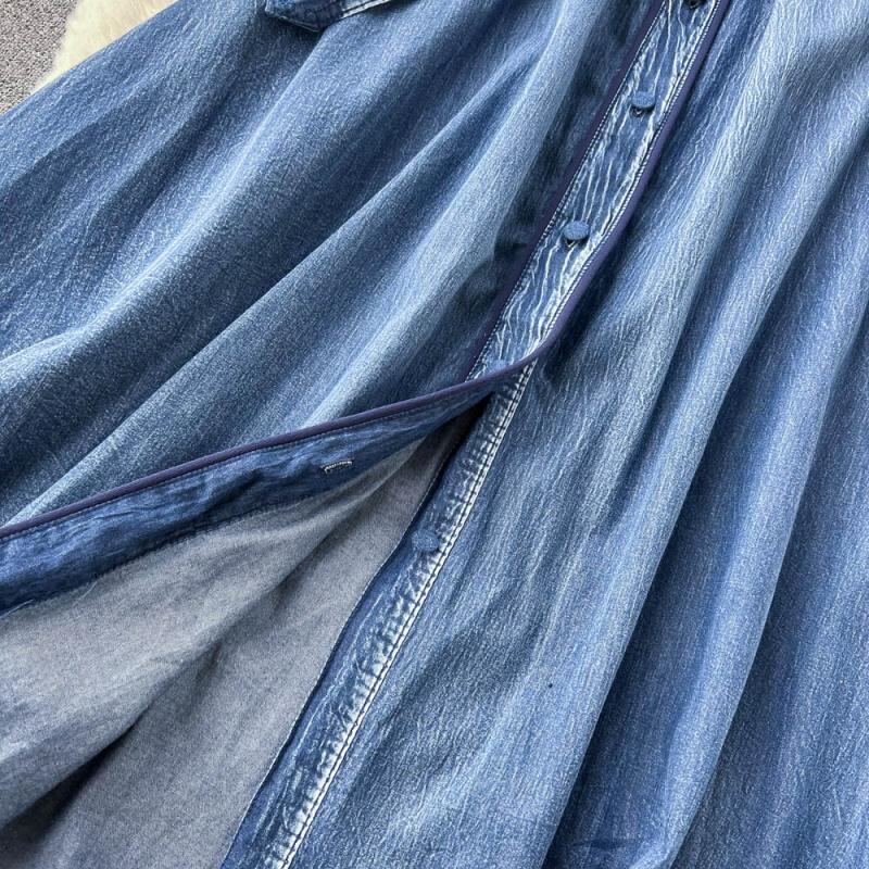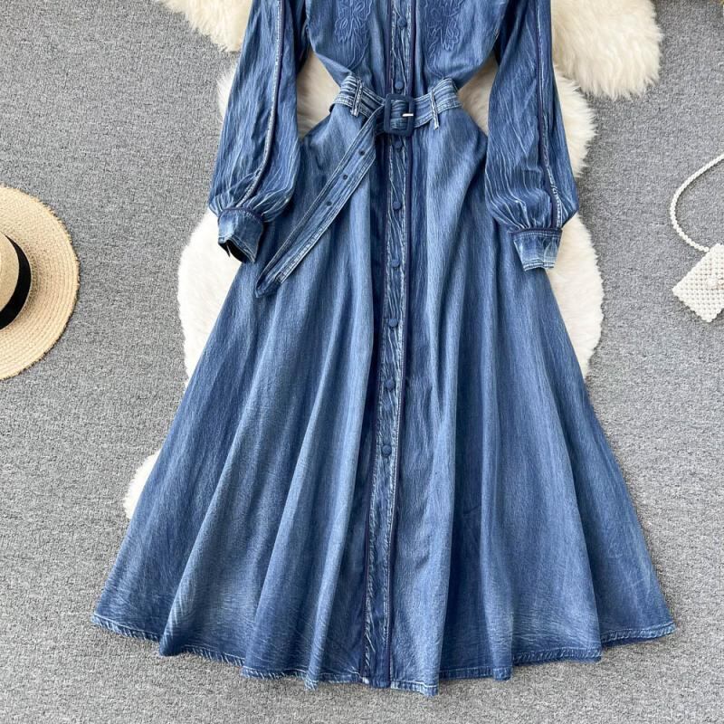 ワンピース デニムスカート デニムワンピース レディース ロングスカート 袖あり 長袖 襟付き スタンダードカラー 刺繍 ウエストマーク ベルト ボタン ボタンダウン 前開き 定番 スタンダード かわいい 大人可愛い 大人 大人女子 きれいめ おしゃれ お洒落 シンプル ラブリー キュート ガーリー フェミニン 10代 20代 30代 学生 通学 デート お出かけ 女子会 休日 普段使い カジュアル こなれ感 ラフ ルーズ 抜け感 ゆったり ゆる パーティー イベント フローラル フラワー ボタニカル