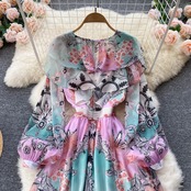 ワンピース ヒラヒラ グラデーション ピンク 緑 グリーン トライバル かわいい レディース ロングスカート フレアスカート 袖あり 長袖 Vネック フリル 大人可愛い 大人 大人女子 きれいめ おしゃれ お洒落 ラブリー キュート ガーリー フェミニン 10代 20代 30代 通勤 学生 通学 デート お出かけ 女子会 休日 普段使い カラフル カジュアル こなれ感 ラフ ルーズ 抜け感 ゆったり 上品 エレガント インスタ映え 披露宴 パーティー イベント フローラル 花柄 フラワー ボタニカル