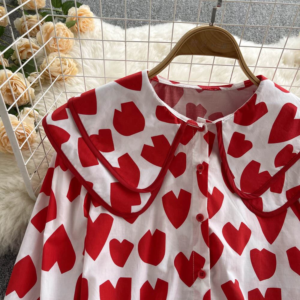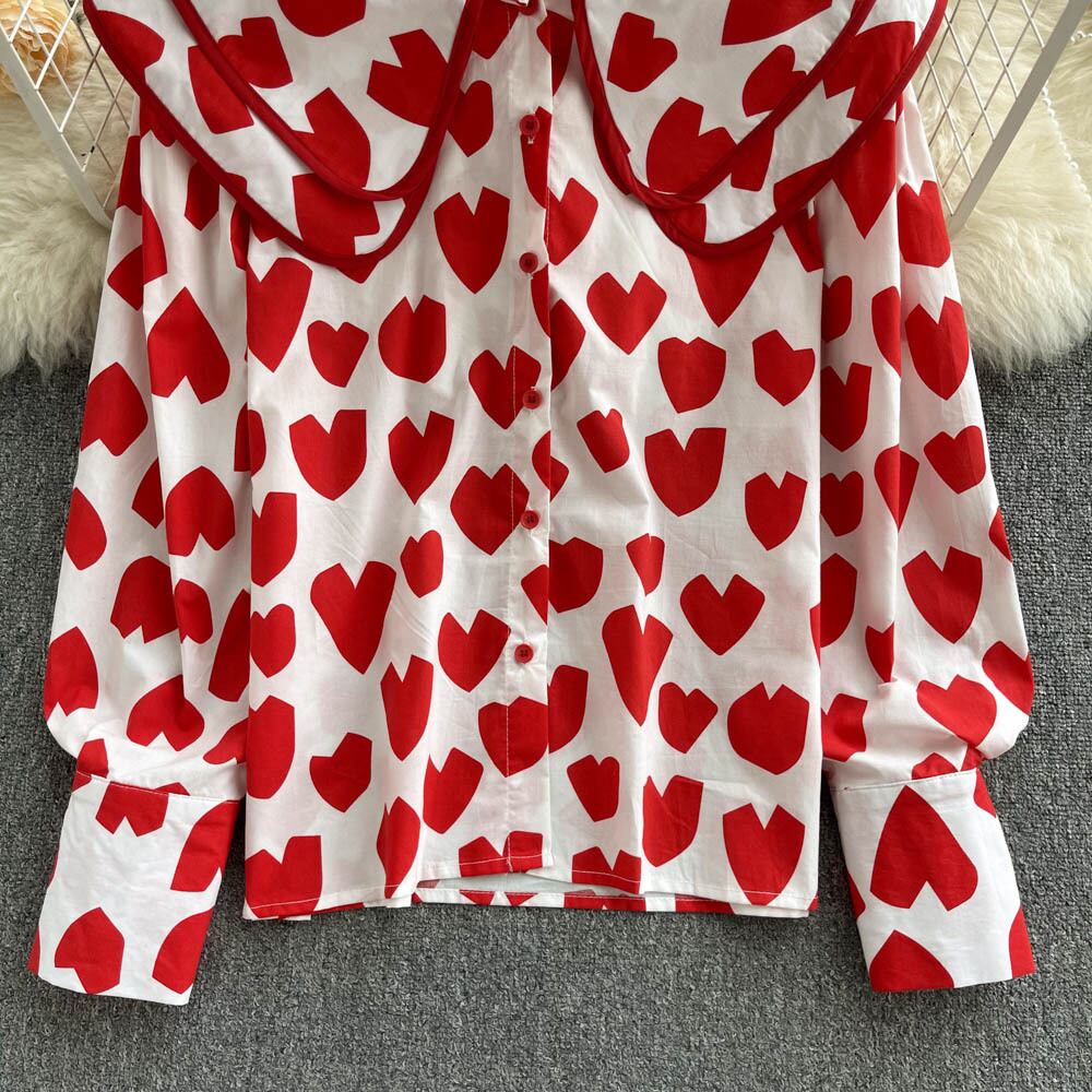 トップス ハート ツートンカラー 白 ホワイト 赤 レッド かわいいシャツ ブラウス 袖あり 長袖 ロングカフス 襟付き ビッグカラー ボタン ボタンダウン 前開き ダブルカラー 大人可愛い 大人 大人女子 きれいめ おしゃれ お洒落 ラブリー キュート ガーリー フェミニン 10代 20代 30代 学生 通学 デート お出かけ 女子会 休日 普段使い インパクト カジュアル こなれ感 ラフ ルーズ 抜け感 個性的 楽ちん 主役級 ゆったり ゆる 着回し パーティー イベント インスタ映え レディース