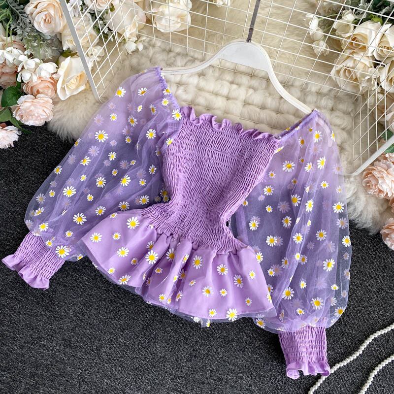トップス ブラウス パフスリーブ 花柄 デイジー オフショル シフォン 長袖 スクエアネック ファンシー キュート かわいい ゆめかわいい 女の子 ポリエステル 袖あり モテ プルオーバー デート お出かけ 女子会 特別な日 イベント 休日 学生 パステルカラー 春 夏 10代 20代 ラブリー ふわふわ インスタ映え 流行 韓国 韓国系 オルチャン ワンサイズ ブラック ホワイト ブルー ピンク パープル アプリコット カラーバリエーション おしゃれ お洒落 ファッション コーデ プチプラ 送料無料