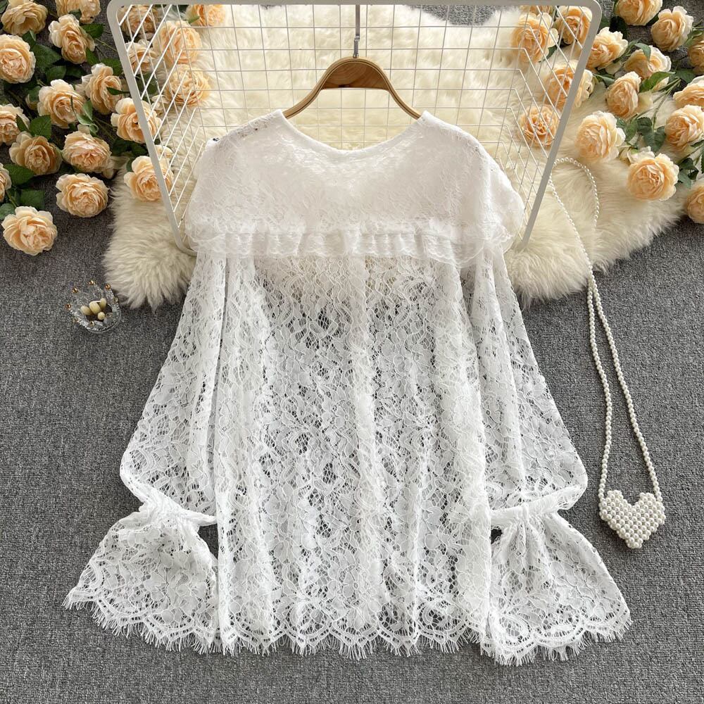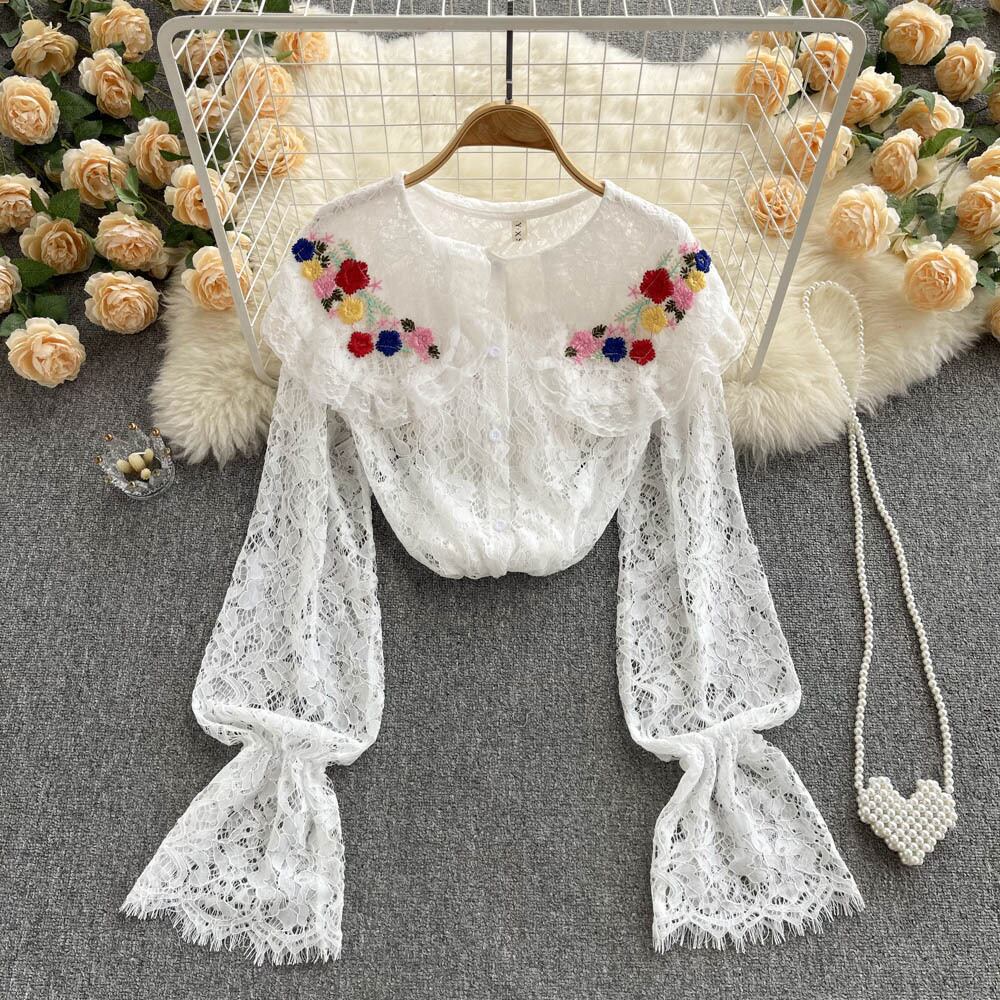 トップス 透け感 シースルー レース 刺繍 白 ホワイト 花 フラワー刺繍 プルオーバー 袖あり 長袖 ベルスリーブ ビッグカラー ラウンドネック Uネック ボタン ボタンダウン 前開き かわいい 大人可愛い 大人 大人女子 きれいめ おしゃれ お洒落 シンプル ラブリー キュート ガーリー フェミニン 10代 20代 30代 通勤 学生 通学 デート お出かけ 女子会 休日 普段使い カジュアル こなれ感 ラフ ルーズ 抜け感 ゆったり ゆる パーティー フローラル 花柄 小花柄 フラワー ボタニカル