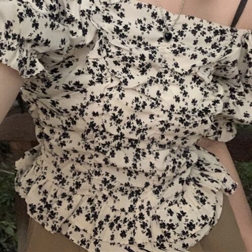 トップス ショート 黒 ブラック モノクロ 花柄 小花柄 フラワー 花柄 ショート丈 ショルダー お出かけ 人気 ギャザリング リゾートファッション 半袖 肩だし フリーサイズ シフォン かわいい 大人可愛い カジュアル 大人カジュアル きれいめ おしゃれ かっこいい 大人女子 メンズライク ガーリー セクシー 上品 ゆる 白 ホワイト 大人カラー 春 夏 デート お出かけ 韓国ファッション トレンド 抜け感 スタイルアップ 通学 学生 OL 10代 20代 30代 こなれ感 ラフ 女っぽ