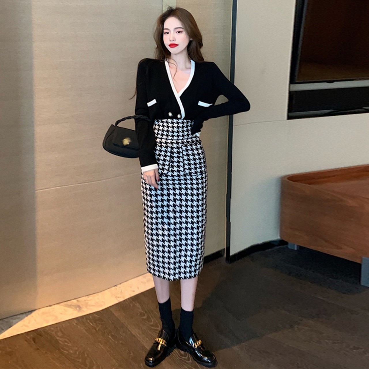 セットアップ レディースジャケット 長袖 スカート タイトスカート ペンシルスカート パイピング 千鳥格子 ボレロ風ジャケット ロングスカート 黒系 柄スカート ハイウエスト 上下セット 簡単コーデ 着まわせる 大人っぽい かっちり系 女っぽい 定番セット 通勤 通学 面接 懇談会 オフィス お食事 お呼ばれ 女子会 面談 きちんと感 大人女子 トレンド おしゃれ オンスタイル 韓国ファッション 韓国服 インポート 輸入服 低価格 お買い得 プチプラ 高コスパ 好感度アップ 女子度アップ 脚長効果