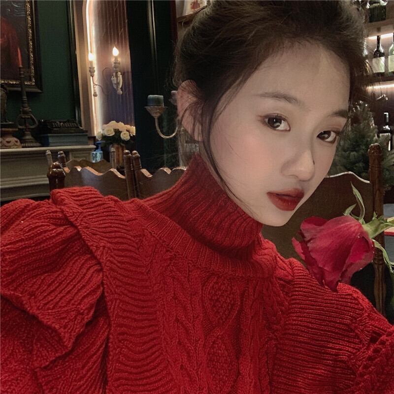 セーター アラン模様 ニットセーター レトロシック 長袖 リブ袖 赤系 無地 シック フリル 丈短め ハイネック タートルネック おしゃれ トレンド 大きめフリル 肩フリル 合わせやすい 可愛い 大人女子 大人可愛い レディース 通勤 通学 デート お食事 ランチ 女子会 飲み会 映える 人気 こっくり色 小顔効果 好感度アップ 高見え 韓国ファッション 韓国服 インポート 輸入服 低価格 お買い得 値段重視 10代 20代 高コスパ プチプラ 簡単コーデ クラシカル 秋冬 おしゃれコーデ モテ服