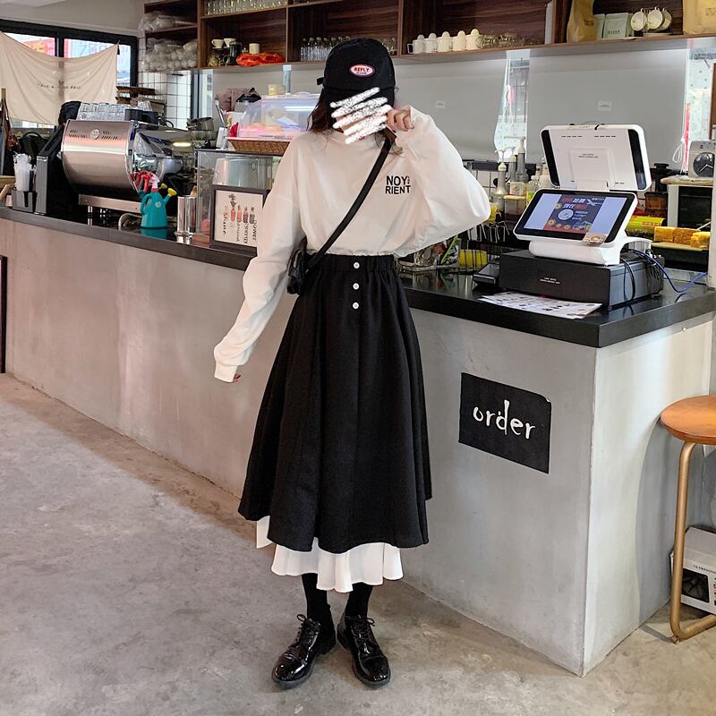 スカート ロングスカート 黒 ブラック 白 ホワイト モノクロ モノトーン フレアスカート フリルスカート レトロデザイン 今風 トレンディ 女性用 デイリー使い ロング丈 大人可愛い カジュアル 大人カジュアル ガーリー おしゃれ かっこいい 大人女子 メンズライク レディライク 単色 秋 冬 デート お出かけ 韓国ファッション トレンド 通学 学生 10代 20代 30代 人気 無地 シンプル 個性的 前ボタン ウエストゴム シンプル ラフ ルーズ こなれ感 抜け感 二重スカート 甘い Aライン