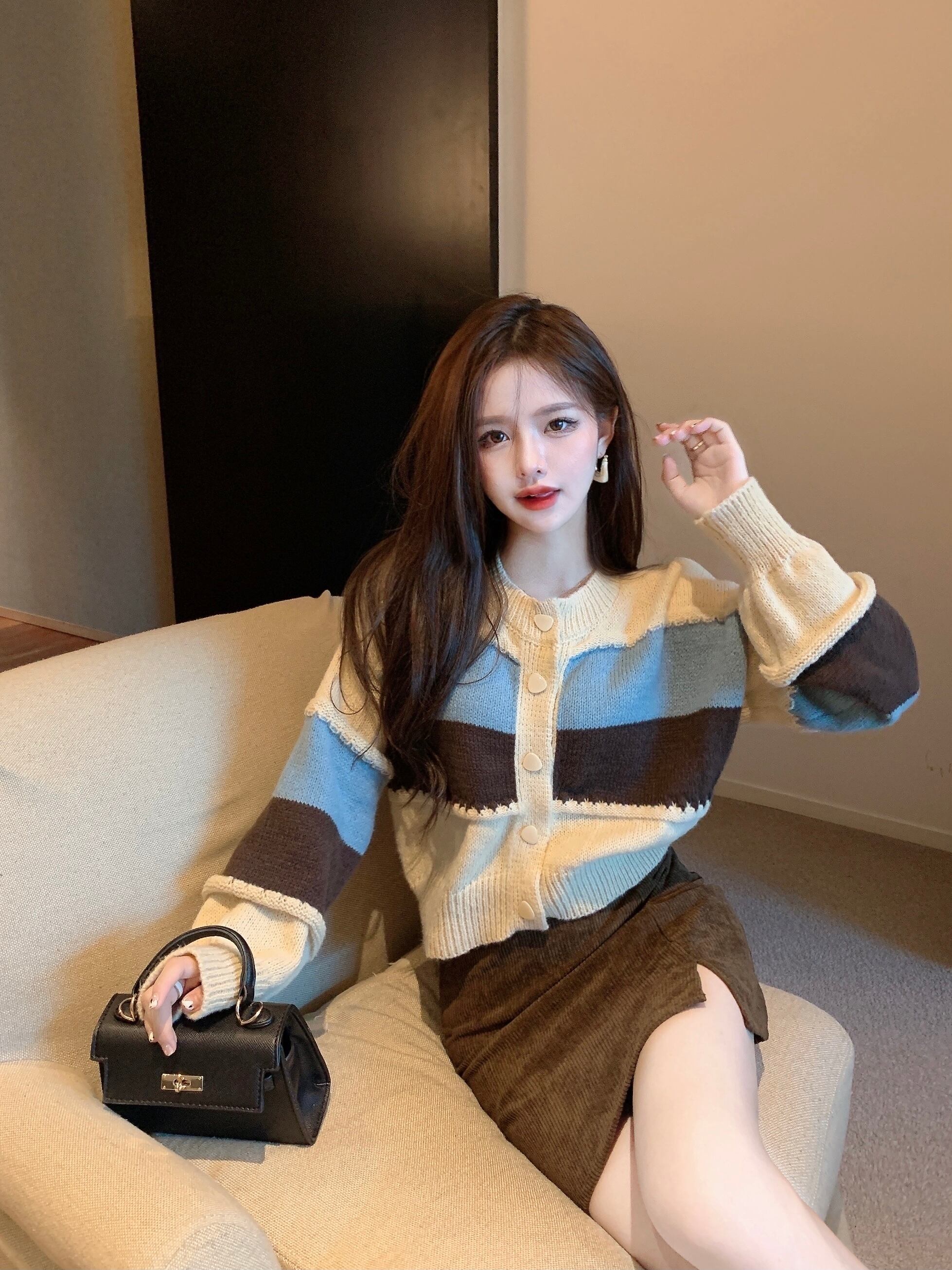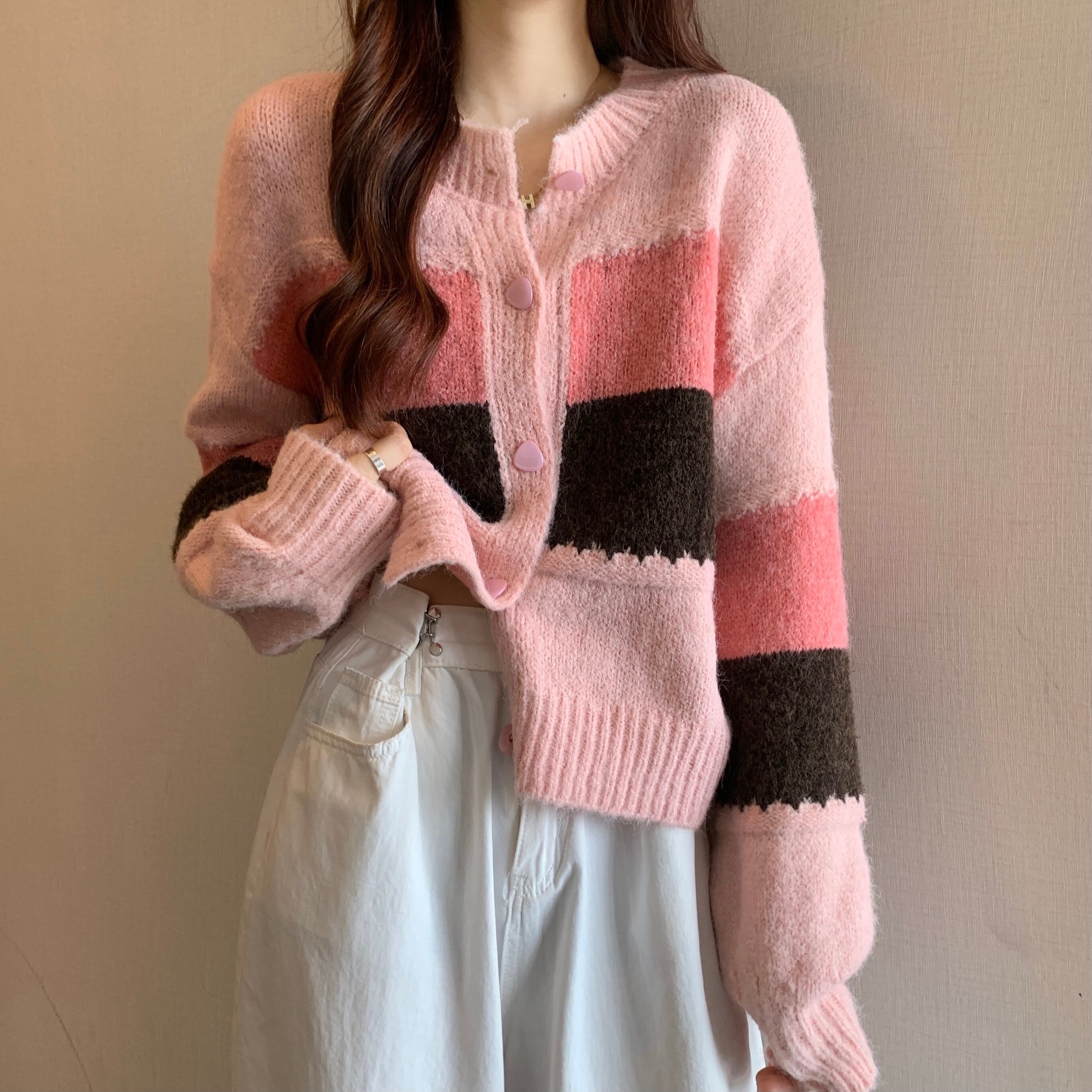 ニット カーディガン ボーダー カラフル 長袖 レディース かわいい キュート ガーリー トップス セーター ラウンドネック ショート丈 モテ デート お出かけ お食事 通勤 OL 通学 学生 休日 女子会 普段使い 韓国 韓国系 韓国ファッション オルチャン 秋 冬 デザイン コーデ 着回し アプリコット ピンク ワンサイズ 10代 20代 30代 個性的 ラフ こなれ感 存在感 カジュアル 楽ちん 大人かわいい 大人女子 あったか 暖かい おしゃれ お洒落 ボタン プチプラ 安い 送料無料 インポート