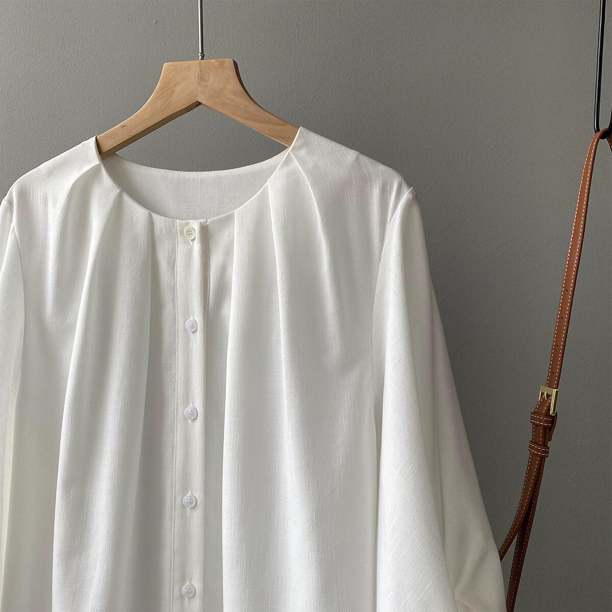 トップス シャツ シンプル カジュアル パフスリーブ 大人 通勤 OL オフィスカジュアル 白 ホワイト カーキ 七分袖 ボタン ラウンドネック 着回し コーデ 普段使い きちんと感 上品 かわいい 大人かわいい 大人女子 こなれ感 清潔感 抜け感 とろみ感 デート お出かけ お食事 お呼ばれ 女子会 休日 10代 20代 30代 40代 きれいめ ラフ モテ ガーリー ゆったり ゆる おしゃれ お洒落 韓国 韓国系 ポリエステル 春 夏 オールシーズン 定番 オススメ 送料無料 インポート プチプラ