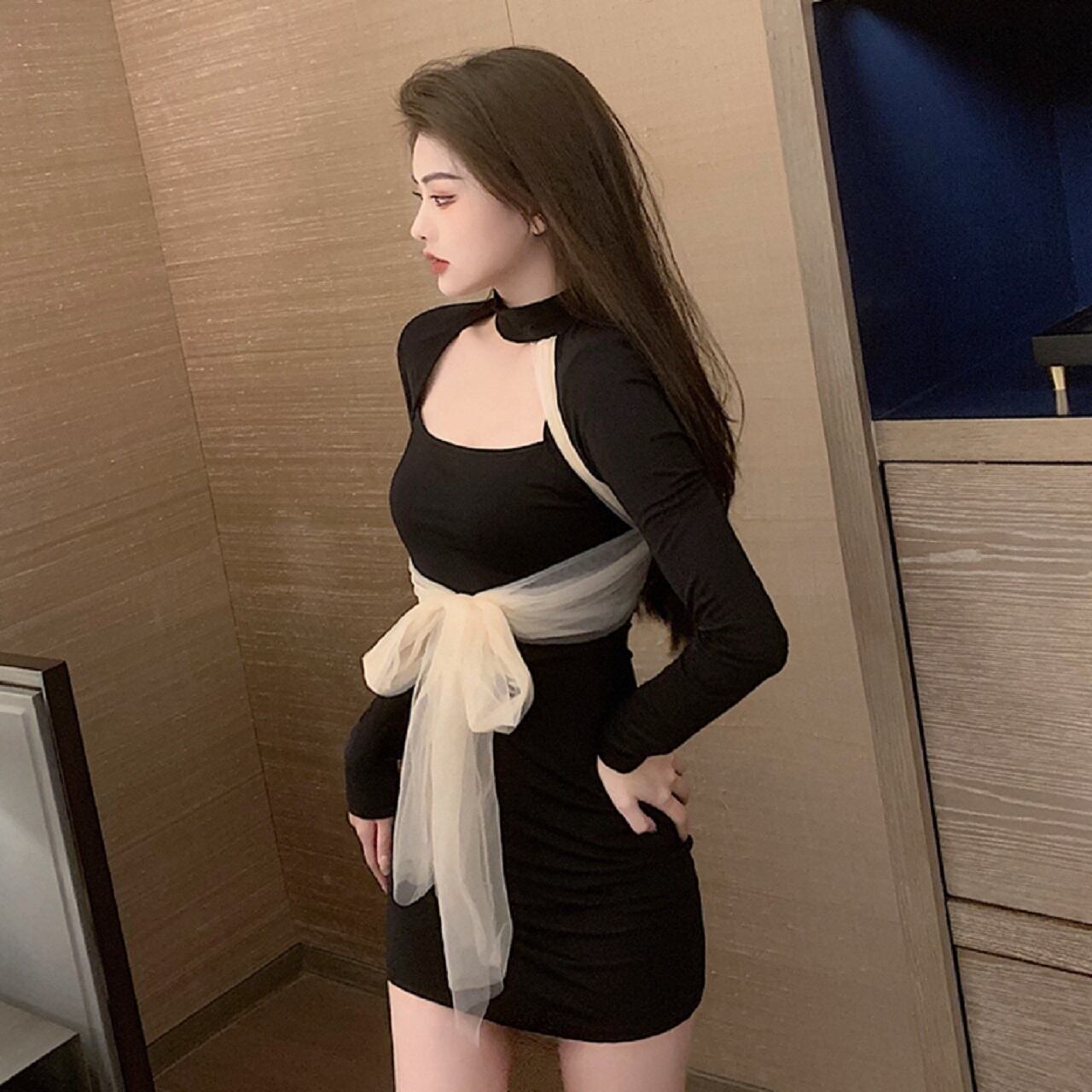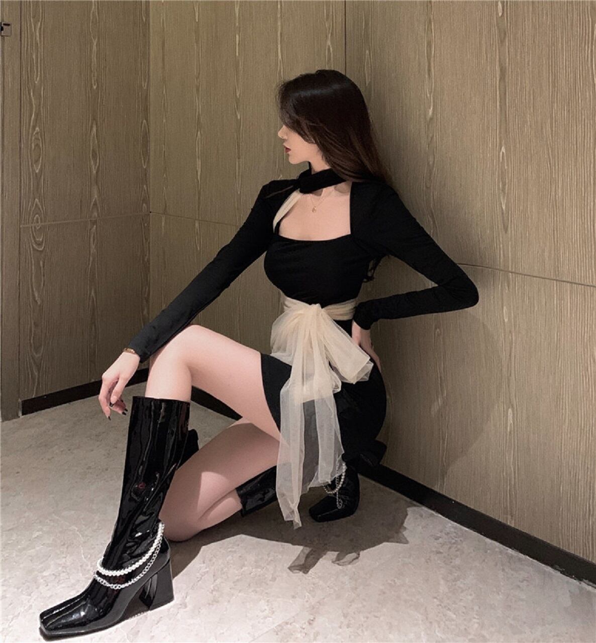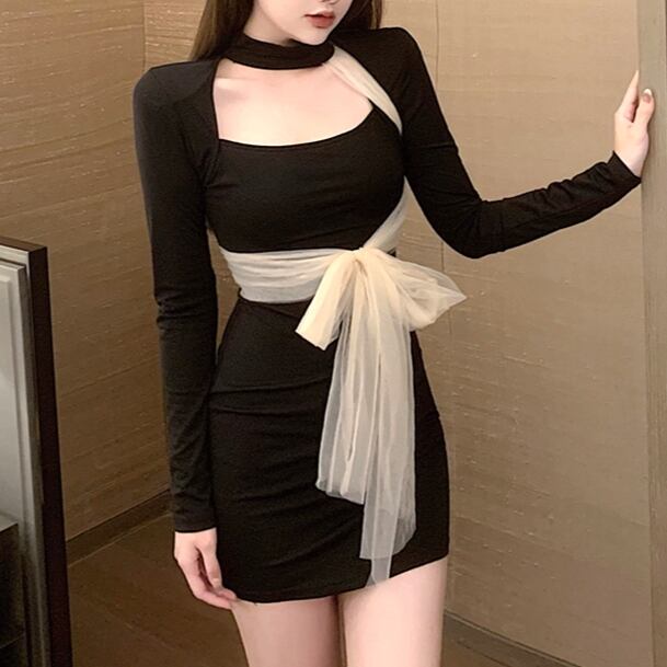 メッシュドレス ブラック 黒 ウエストリボン メッシュリボン ミニ丈ドレス フィット クールネック タイトワンピース ヒップスカート スクエアネック タイト プレーンスタイル レギュラーコンビネーション シングルピース スカートタイプ シーズン 長袖 ショートスカート プルオーバー スリムフィット イベント 二次会 飲み会 パーティー メンズライク 海外ファッション インポートファッション トレンディ トレンド 人気アイテム ホットアイテム インスタ映え 映える リボンワンピース ワンピドレス 美脚効果