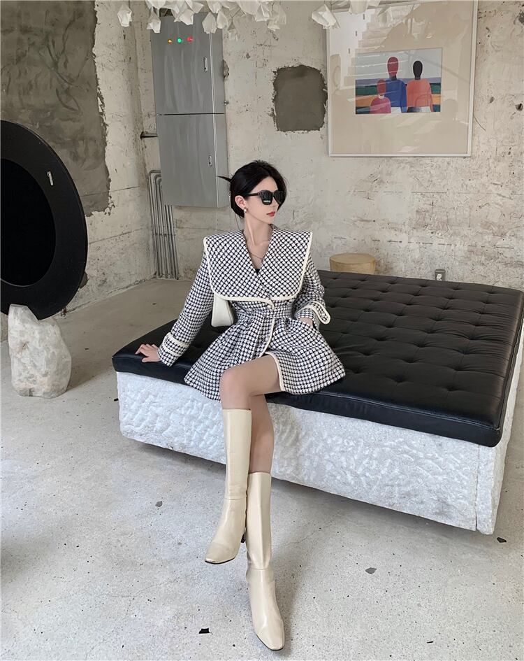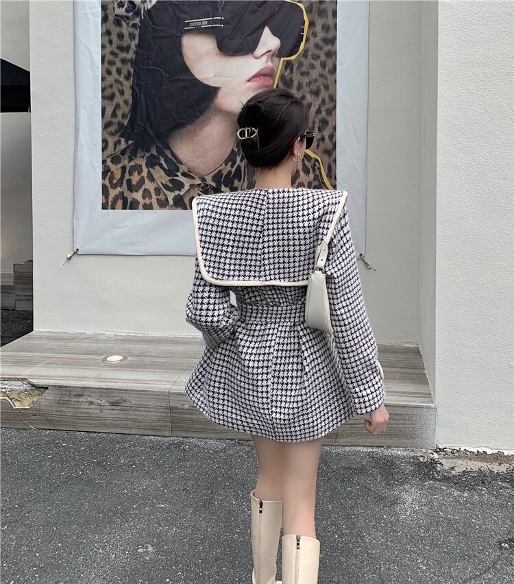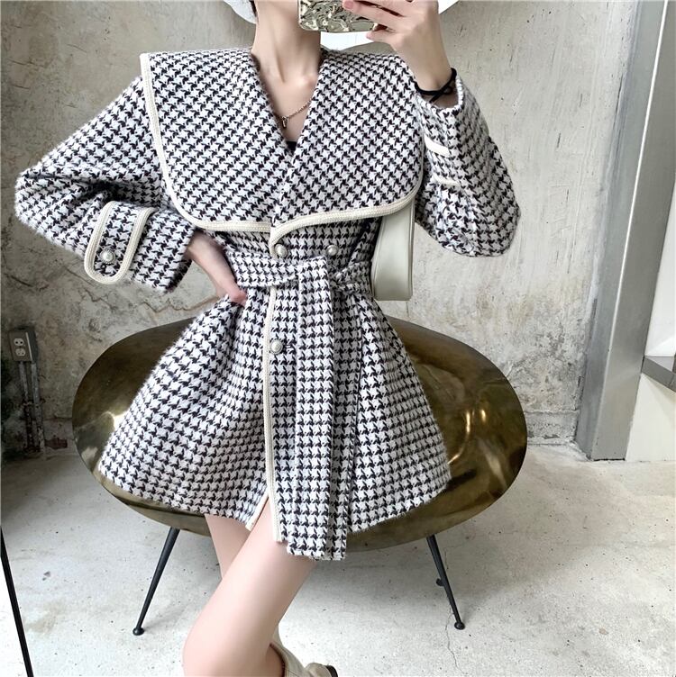 ハーフコート レディース 千鳥格子 ショートコート 大きめ襟 セーラーカラー Vネック 黒白千鳥格子 パイピング 共布ベルト 大人っぽい エレガント モダン トレンド おしゃれ 綺麗め 袖周り飾り 小顔効果 大人女子 ミニ丈 ワンピース風 コートドレス かっこかわいい クールフェミニン 冬アウター 通勤 通学 デート ショッピング お呼ばれ オフィス 特別な日 お出かけ着 韓国ファッション 韓国服 インポート 低価格 輸入服 プチプラ お買い得 着やすい 高コスパ 大人 20代 30代 40代 かっこいい