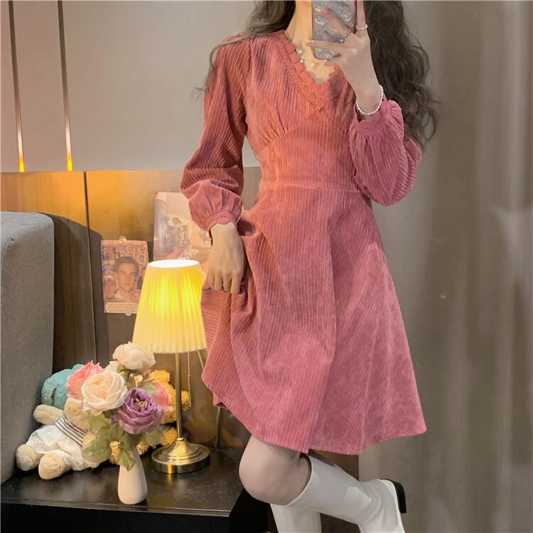 ワンピース レディース 女性用 コーデュロイ ショート丈 ミニ丈 ドレス 長袖 レース 切り替えし デイリー使い 大人可愛い カジュアル 大人カジュアル ふわふわ系 ガーリー おしゃれ 大人女子 メンズライク レディライク Vネック 単色 ピンク 秋 冬 デート お出かけ 韓国ファッション トレンド 通学 学生 10代 20代 30代 人気 無地 シンプル 個性的 ラフ こなれ感 抜け感 甘い 脚長効果 着瘦せ ハイウエスト