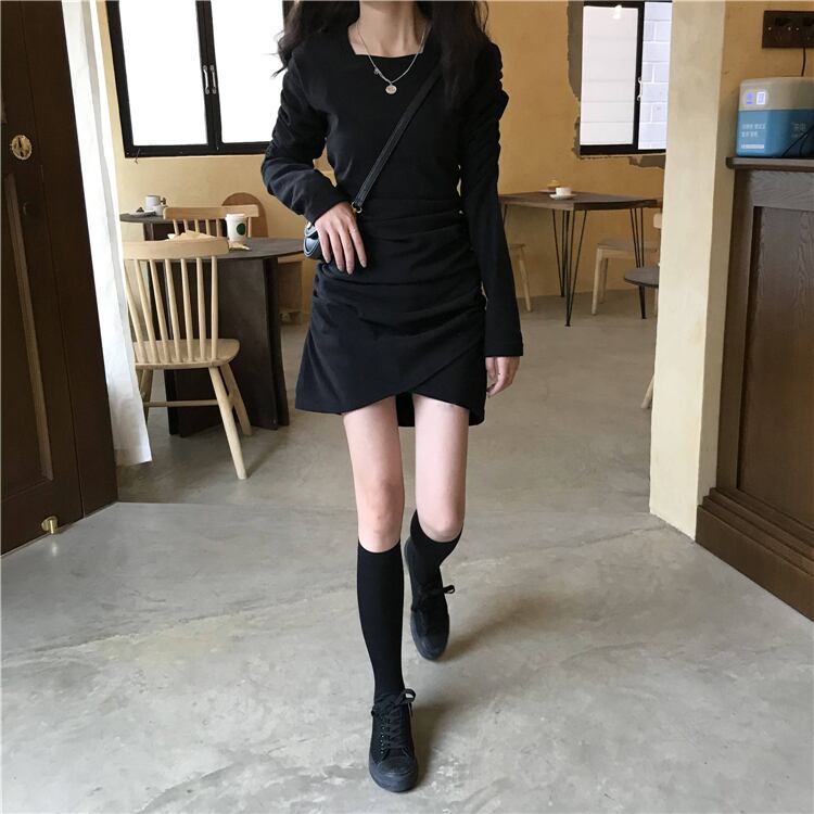 ワンピース ミニ丈 ショート丈 黒 ブラック ゴム くしゅくしゅ 肩 ボリューム スクエアネック 美脚効果 カジュアル 首元 デイリー使い 大人可愛い カジュアル 大人カジュアル かわいい ガーリー おしゃれ 大人女子 フォーマル メンズライク レディライク 単色 秋 冬 デート レディース 女性用 お出かけ 韓国ファッション かっこいい トレンド OL 通学 学生 10代 20代 30代 サイズ 多種 人気 モノクロ モノトーン 無地 シンプル 個性的 ラフ こなれ感 二重 脚長 細みえ 着痩せ